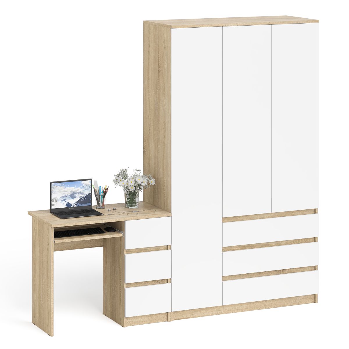 Комплектация включает стол компьютерный Мори МС-6 правый и широкий шкаф-комод Мори МШ1200.1. Продуманная конструкция позволяет убрать лишние предметы, тем самым сохраняя единый стиль оформления помещения. Роль ручек выполняют сами фасады. Аккуратный стол Мори МС-6 компьютерный правый с тумбой и выдвижной панелью для клавиатуры. Тумба имеет три выдвижных ящика на роликовых направляющих. Стол компьютерный три ящика Мори МС-6 правый не имеет универсальной сборки - выдвижной ящик расположен слева. Широкий шкаф-комод Мори МШ1200.1 оборудован тремя распашными дверями и тремя выдвижными ящиками. Слева за дверкой расположено отделение с горизонтальной штангой (372 мм) для одежды на плечиках, антресольной полкой и нижней нишей. Справа сверху за дверьми отделение с тремя полками и снизу тремя выдвижными ящиками. Шкаф-комод не универсален при сборке - отделение с ящиками располагается только справа.