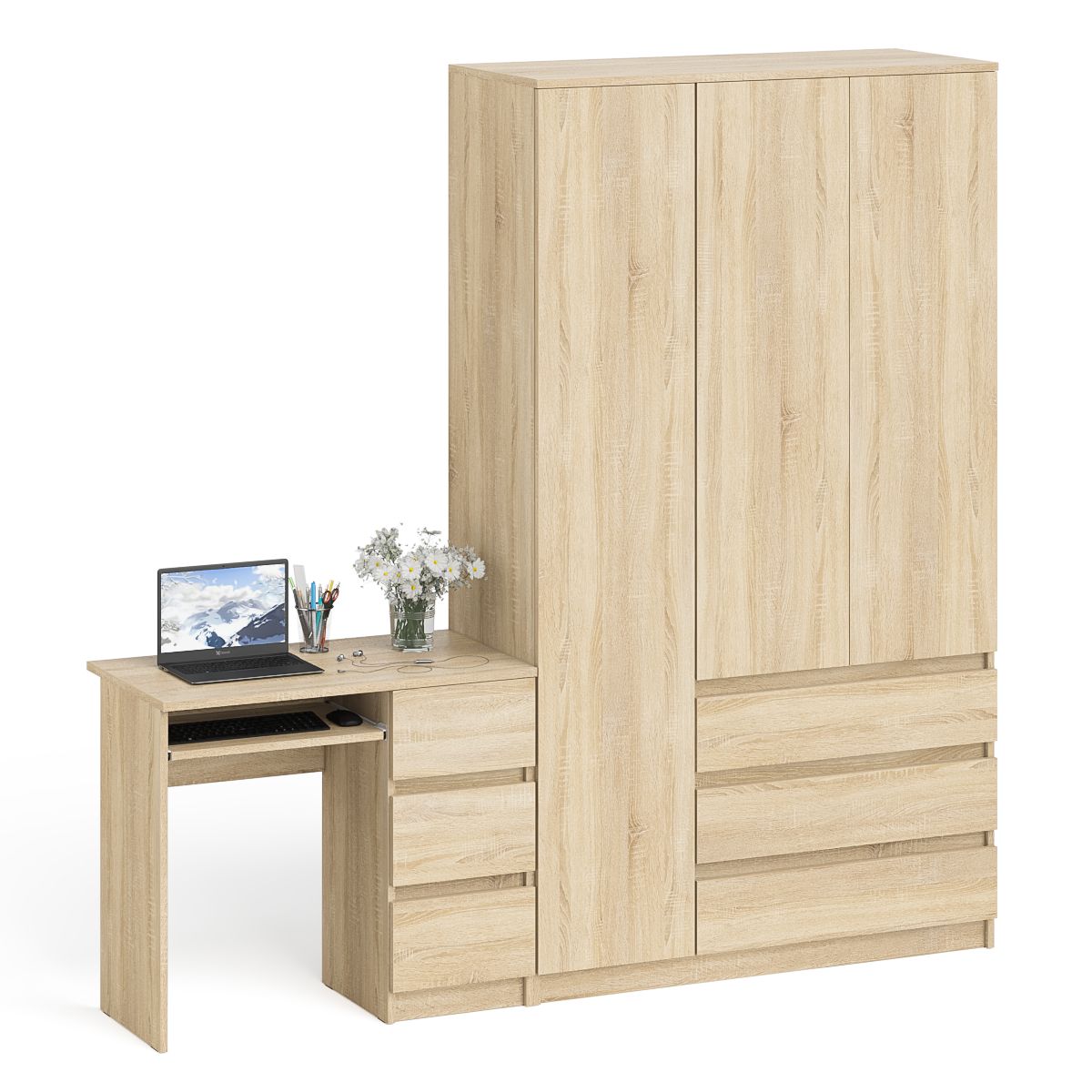 Комплектация включает стол компьютерный Мори МС-6 правый и широкий шкаф-комод Мори МШ1200.1. Продуманная конструкция позволяет убрать лишние предметы, тем самым сохраняя единый стиль оформления помещения. Роль ручек выполняют сами фасады. Аккуратный стол Мори МС-6 компьютерный правый с тумбой и выдвижной панелью для клавиатуры. Тумба имеет три выдвижных ящика на роликовых направляющих. Стол компьютерный три ящика Мори МС-6 правый не имеет универсальной сборки - выдвижной ящик расположен слева. Широкий шкаф-комод Мори МШ1200.1 оборудован тремя распашными дверями и тремя выдвижными ящиками. Слева за дверкой расположено отделение с горизонтальной штангой (372 мм) для одежды на плечиках, антресольной полкой и нижней нишей. Справа сверху за дверьми отделение с тремя полками и снизу тремя выдвижными ящиками. Шкаф-комод не универсален при сборке - отделение с ящиками располагается только справа.