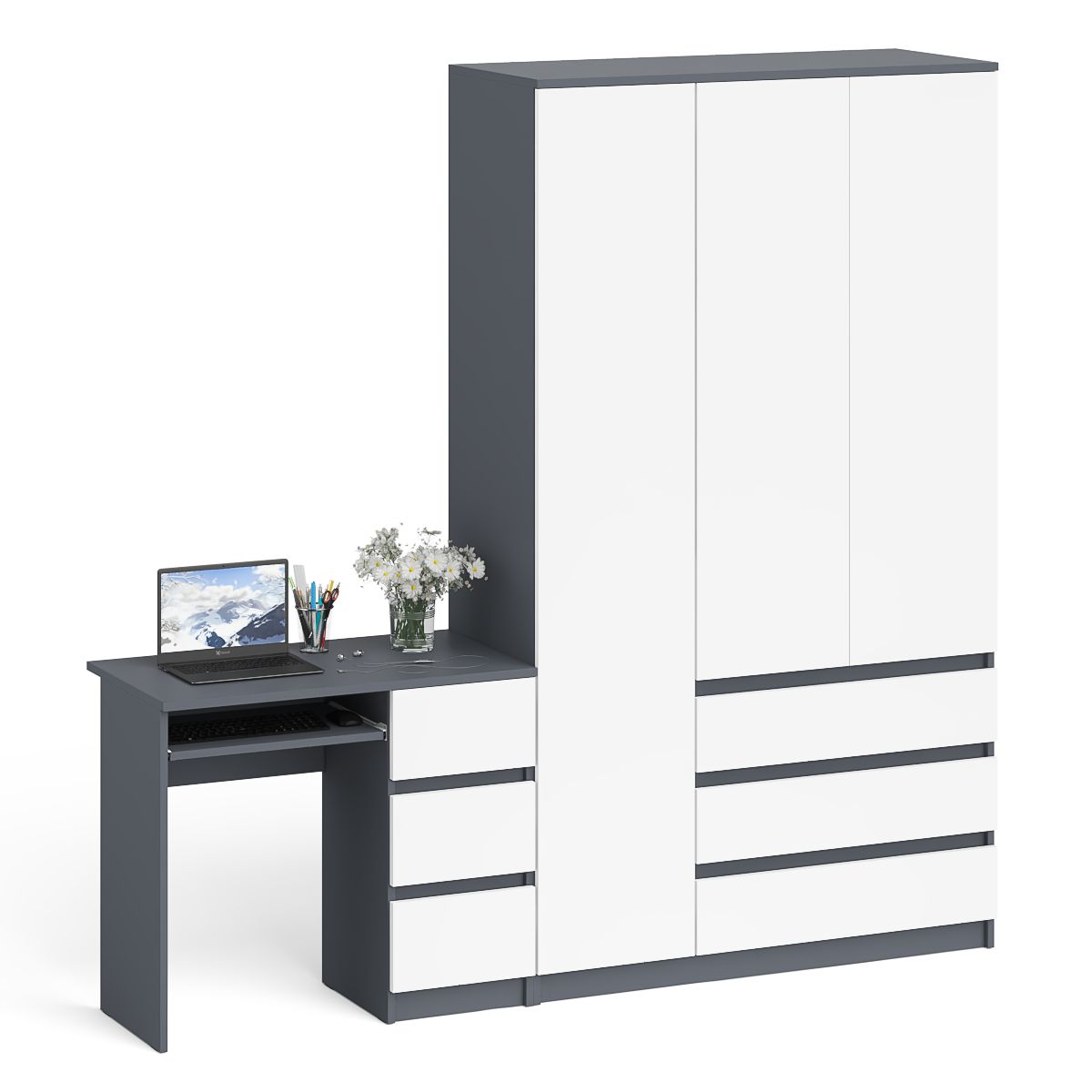 Открывание ящиков и малых дверей шкафа производится за счет пространства между планками и фасадами, высокой двери - за счет системы «Push-to-open». Выдвижные ящики на роликовых направляющих (стола L=350 мм, шкафа L=400 мм) неполного выдвижения обеспечивают комфортную эксплуатацию. На нижних кромках опор предусмотрены пластиковые подпятники для защиты поверхности пола от механических повреждений. Поставляется в разобранном виде в надёжной упаковке, с комплектом сборочной фурнитуры и инструкцией по сборке.