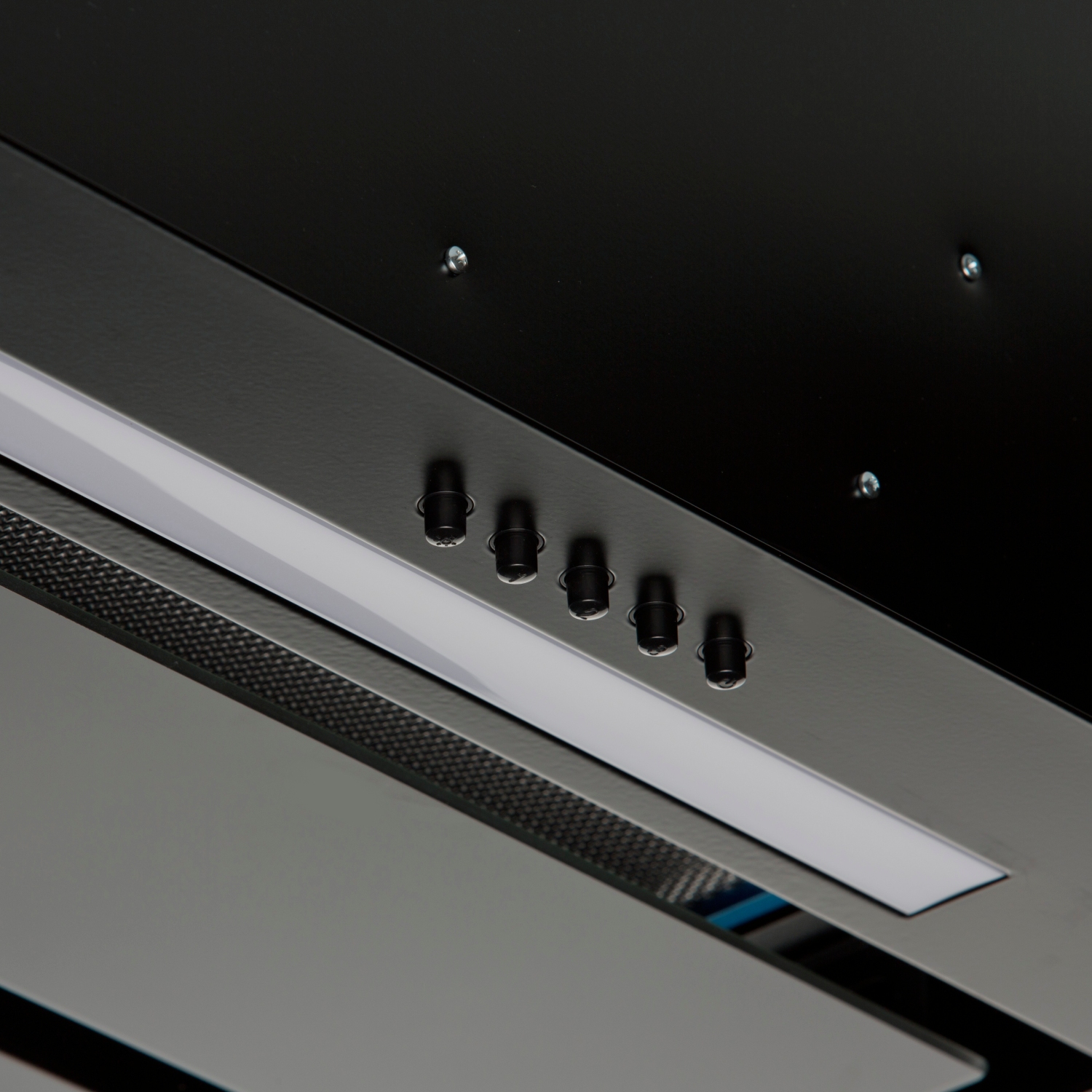 • Полностью встраиваемая вытяжка.Стильное сочетание закаленного стекла и окрашенной стали. Декоративный люк из закаленного стекла скрывает пятислойный алюминиевый, жироулавливающий фильтр с усиленной конструкцией