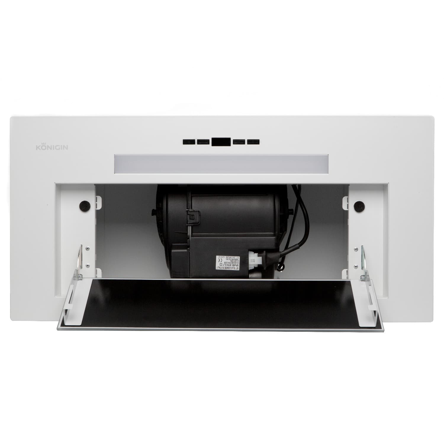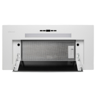 • Полностью встраиваемая вытяжка.Стильное сочетание закаленного стекла и окрашенной стали. Декоративный люк из закаленного стекла скрывает пятислойный алюминиевый, жироулавливающий фильтр с усиленной конструкцией