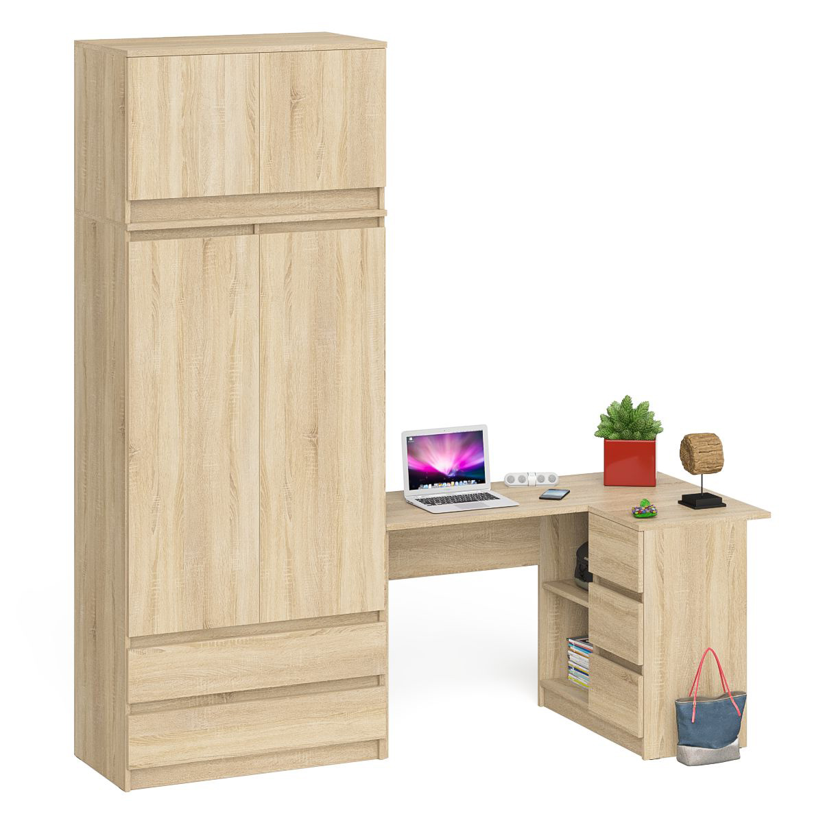 Комплектация включает стол компьютерный Мори МС-16 правый , шкаф-комод Мори МШ900.1 и антресоль Мори МА900.1. Продуманная конструкция позволяет убрать лишние предметы, тем самым сохраняя единый стиль оформления помещения. Роль ручек выполняют сами фасады. Угловой компьютерный стол Мори МС-16 правый - конструктивно тумба со столешницей образуют угол. Тумба имеет 3 выдвижных ящика и нишу с полкой по середине. Угловой компьютерный стол Мори МС-16 правый не универсален при сборке - тумба с ящиками располагается справа. Шкаф-комод Мори МШ900.1 оборудован двумя распашными дверями сверху и двумя выдвижными ящиками снизу. За дверями расположены два отделения с одной стороны с горизонтальной штангой (420 мм.) для одежды на плечиках, с другой с тремя полками. За распашными дверками антресоли Мори МА900.1 расположена полка по центру, что позволяет убрать лишние предметы, тем самым сохраняя единый стиль оформления помещения.