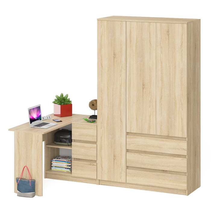 Комплектация включает стол компьютерный Мори МС-16 правый и широкий шкаф-комод Мори МШ1200.1. Продуманная конструкция позволяет убрать лишние предметы, тем самым сохраняя единый стиль оформления помещения. Роль ручек выполняют сами фасады. Угловой компьютерный стол Мори МС-16 правый - конструктивно тумба со столешницей образуют угол. Тумба имеет 3 выдвижных ящика и нишу с полкой по середине. Угловой компьютерный стол Мори МС-16 правый не универсален при сборке - тумба с ящиками располагается справа. Широкий шкаф-комод Мори МШ1200.1 оборудован тремя распашными дверями и тремя выдвижными ящиками. Слева за дверкой расположено отделение с горизонтальной штангой (372 мм) для одежды на плечиках, антресольной полкой и нижней нишей. Справа сверху за дверьми отделение с тремя полками и снизу тремя выдвижными ящиками. Шкаф-комод не универсален при сборке - отделение с ящиками располагается только справа.