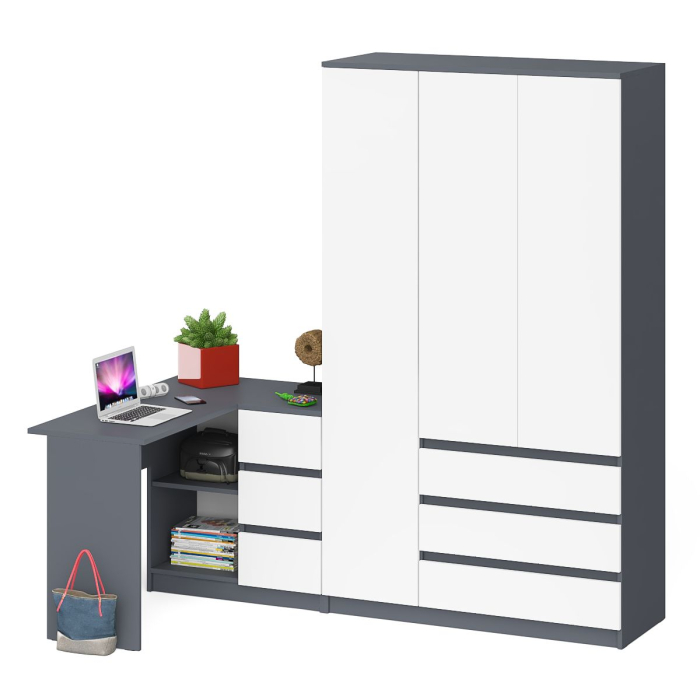 Комплектация включает стол компьютерный Мори МС-16 правый и широкий шкаф-комод Мори МШ1200.1. Продуманная конструкция позволяет убрать лишние предметы, тем самым сохраняя единый стиль оформления помещения. Роль ручек выполняют сами фасады. Угловой компьютерный стол Мори МС-16 правый - конструктивно тумба со столешницей образуют угол. Тумба имеет 3 выдвижных ящика и нишу с полкой по середине. Угловой компьютерный стол Мори МС-16 правый не универсален при сборке - тумба с ящиками располагается справа. Широкий шкаф-комод Мори МШ1200.1 оборудован тремя распашными дверями и тремя выдвижными ящиками. Слева за дверкой расположено отделение с горизонтальной штангой (372 мм) для одежды на плечиках, антресольной полкой и нижней нишей. Справа сверху за дверьми отделение с тремя полками и снизу тремя выдвижными ящиками. Шкаф-комод не универсален при сборке - отделение с ящиками располагается только справа.