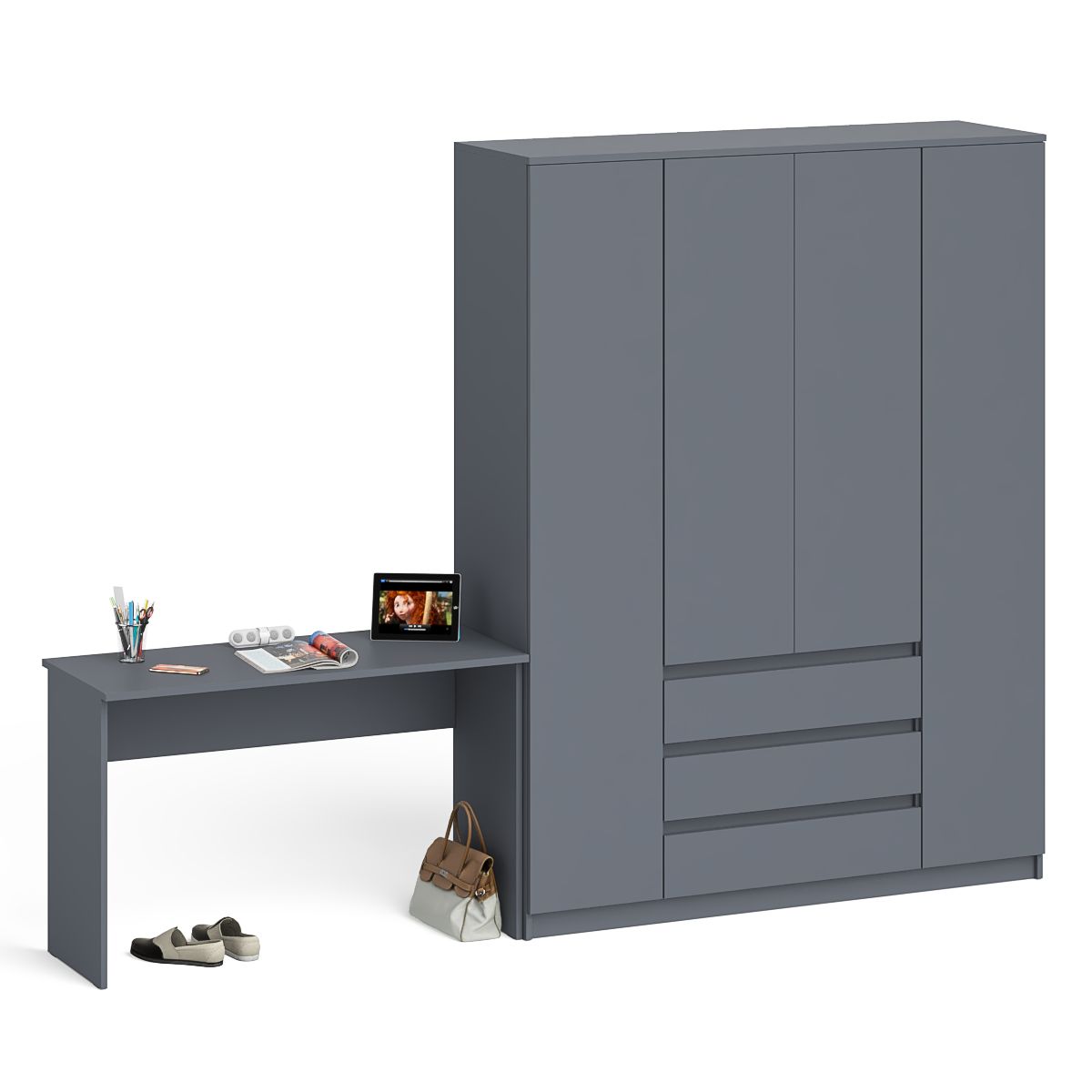 Комплектация включает стол письменный Мори МСП1200.1 и шкаф-комод Мори МШ1600.1. Продуманная конструкция позволяет убрать лишние предметы, тем самым сохраняя единый стиль оформления помещения. Роль ручек выполняют сами фасады. Стол письменный Мори МСП1200.1 - простой аккуратный стол без тумб и ящиков - минималистичный дизайн и доступная цена. Столещница размером 120х50 см. вместит все необходимые принадлежности для работы. По бокам располагаются две опоры из ЛДСП выполняющие роль ножек. С задней стороны стола имеется царга - верхняя соединительная планка между ножками. Шкаф-комод с тремя ящиками и четырьмя дверками Мори МШ1600.1 оборудован тремя отделениями. Центральное сверху за распашными дверьми с тремя полками и снизу тремя выдвижными ящиками. По бокам расположены два отделения с горизонтальными штангами (2х372 мм) для одежды на плечиках, антресольной полкой и нижней нишей в каждом.