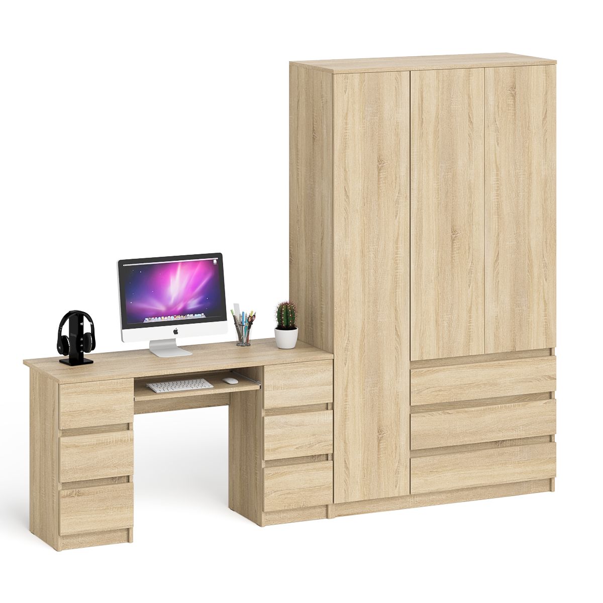 Комплектация включает компьютерный стол Мори МС-2 и широкий шкаф-комод Мори МШ1200.1. Продуманная конструкция позволяет убрать лишние предметы, тем самым сохраняя единый стиль оформления помещения. Роль ручек выполняют сами фасады. Стол с 2 тумбами оборудован 6 ящиками и выдвижной полкой для клавиатуры. Под столешницей по бокам расположены две тумбы с тремя выдвижными ящиками в каждой. Широкий шкаф-комод Мори МШ1200.1 оборудован тремя распашными дверями и тремя выдвижными ящиками. Слева за дверкой расположено отделение с горизонтальной штангой (372 мм) для одежды на плечиках, антресольной полкой и нижней нишей. Справа сверху за дверьми отделение с тремя полками и снизу тремя выдвижными ящиками. Шкаф-комод не универсален при сборке - отделение с ящиками располагается только справа.