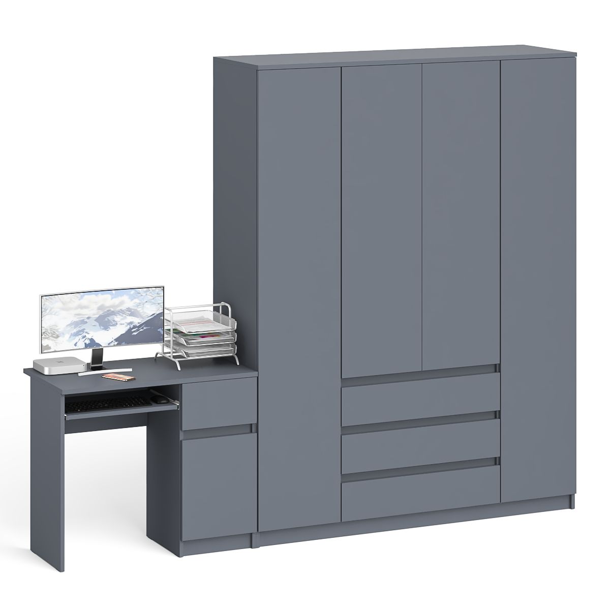 Открывание ящиков и малых дверей шкафа производится за счет пространства между планками и фасадами, высоких дверей - за счет системы «Push-to-open». Выдвижные ящики на роликовых направляющих (стола L=350 мм, шкафа L=400 мм) неполного выдвижения обеспечивают комфортную эксплуатацию. На нижних кромках опор предусмотрены пластиковые подпятники для защиты поверхности пола от механических повреждений. Поставляется в разобранном виде в надёжной упаковке, с комплектом сборочной фурнитуры и инструкцией по сборке.
