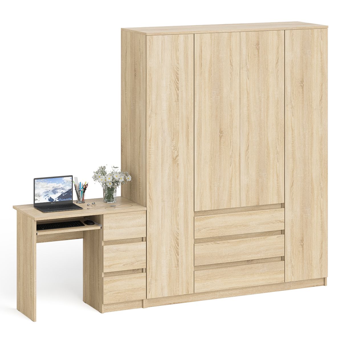 Комплектация включает стол компьютерный Мори МС-6 правый и шкаф-комод Мори МШ1600.1. Продуманная конструкция позволяет убрать лишние предметы, тем самым сохраняя единый стиль оформления помещения. Роль ручек выполняют сами фасады. Аккуратный стол Мори МС-6 компьютерный правый с тумбой и выдвижной панелью для клавиатуры. Тумба имеет три выдвижных ящика на роликовых направляющих. Стол компьютерный три ящика Мори МС-6 правый не имеет универсальной сборки - выдвижной ящик расположен слева. Шкаф-комод с тремя ящиками и четырьмя дверками Мори МШ1600.1 оборудован тремя отделениями. Центральное сверху за распашными дверьми с тремя полками и снизу тремя выдвижными ящиками. По бокам расположены два отделения с горизонтальными штангами (2х372 мм) для одежды на плечиках, антресольной полкой и нижней нишей в каждом.