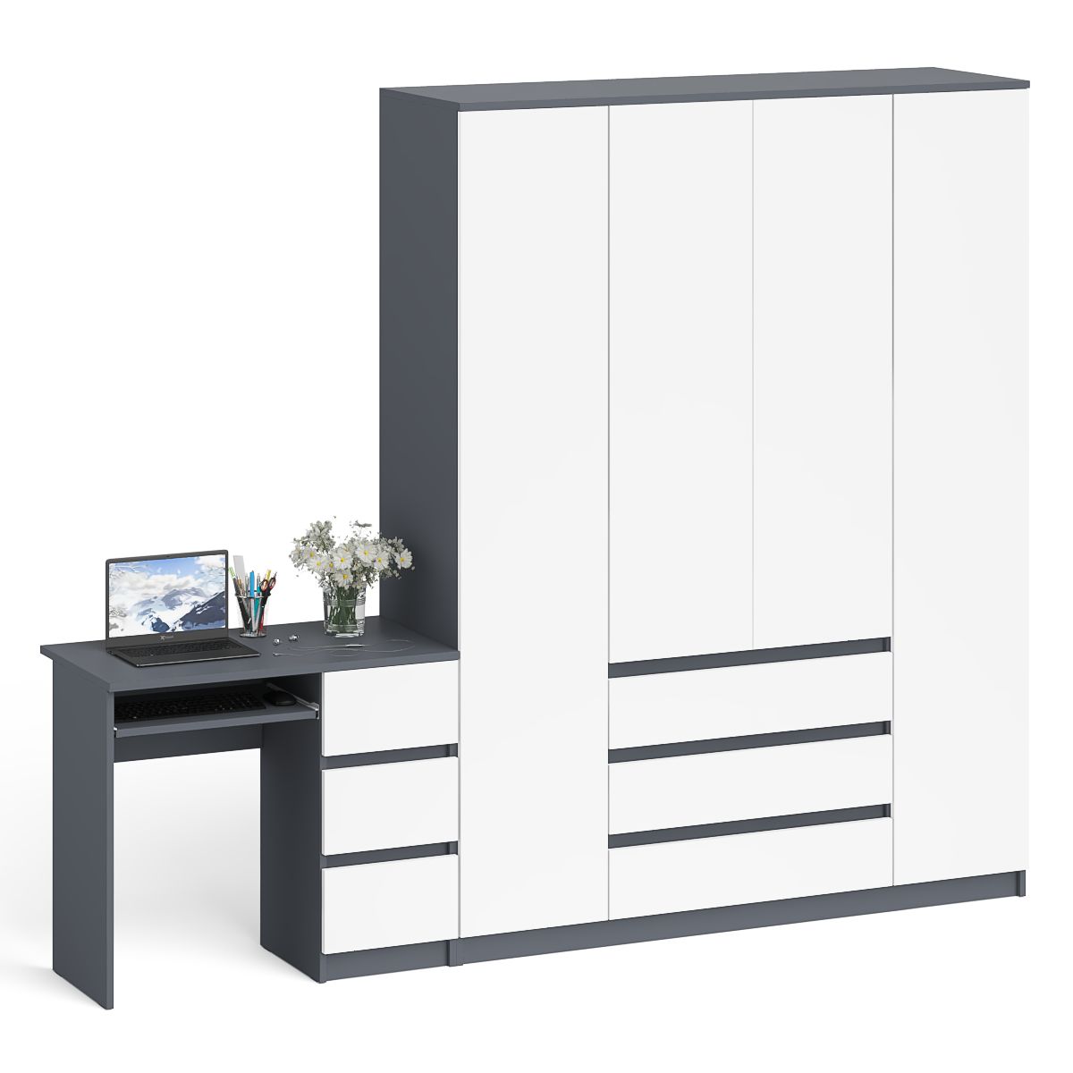 Открывание ящиков и малых дверей шкафа производится за счет пространства между планками и фасадами, высоких дверей - за счет системы «Push-to-open». Выдвижные ящики на роликовых направляющих (стола L=350 мм, шкафа L=400 мм) неполного выдвижения обеспечивают комфортную эксплуатацию. На нижних кромках опор предусмотрены пластиковые подпятники для защиты поверхности пола от механических повреждений. Поставляется в разобранном виде в надёжной упаковке, с комплектом сборочной фурнитуры и инструкцией по сборке.