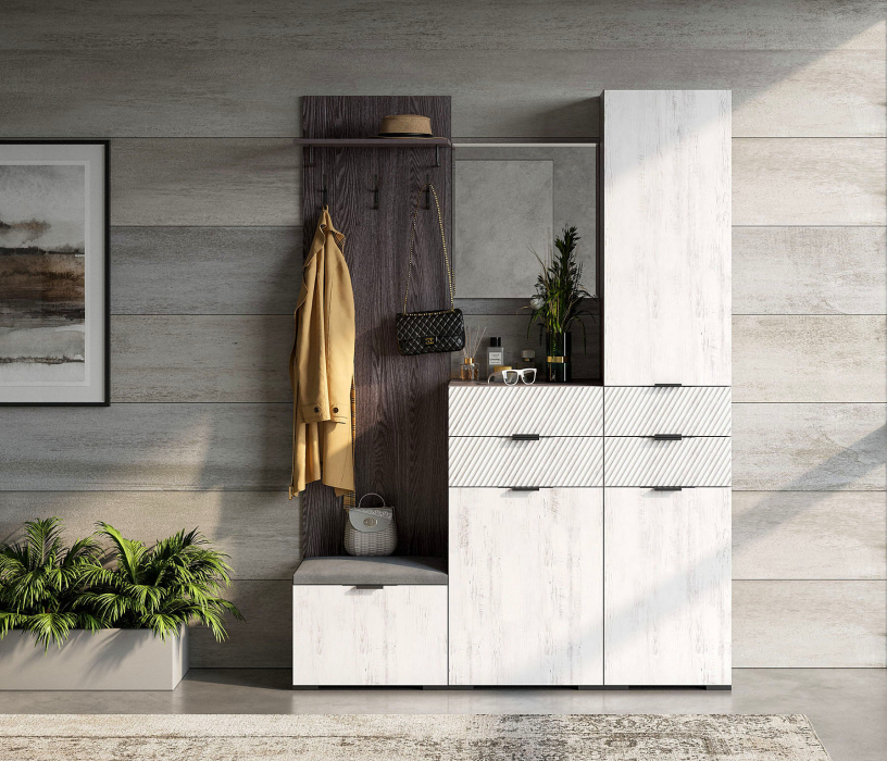 Новые современные цвета: черный ясень — это глубокий серый, легкий и одновременно динамичный цвет в сочетании с санторини белым — цвет с древесными линиями, создающими гармоничный контраст, наполняя пространство воздухом и природной энергией. Визуальная легкость, эстетика графики, элегантная окантовка с четкими формами, баланс теплых и холодных оттенков легли в основу дизайна новых модулей. Комоды и тумбы укомплектованы направляющими полного выдвижения. Строгая лаконичная ручка черного цвета. Крышки 32 мм.