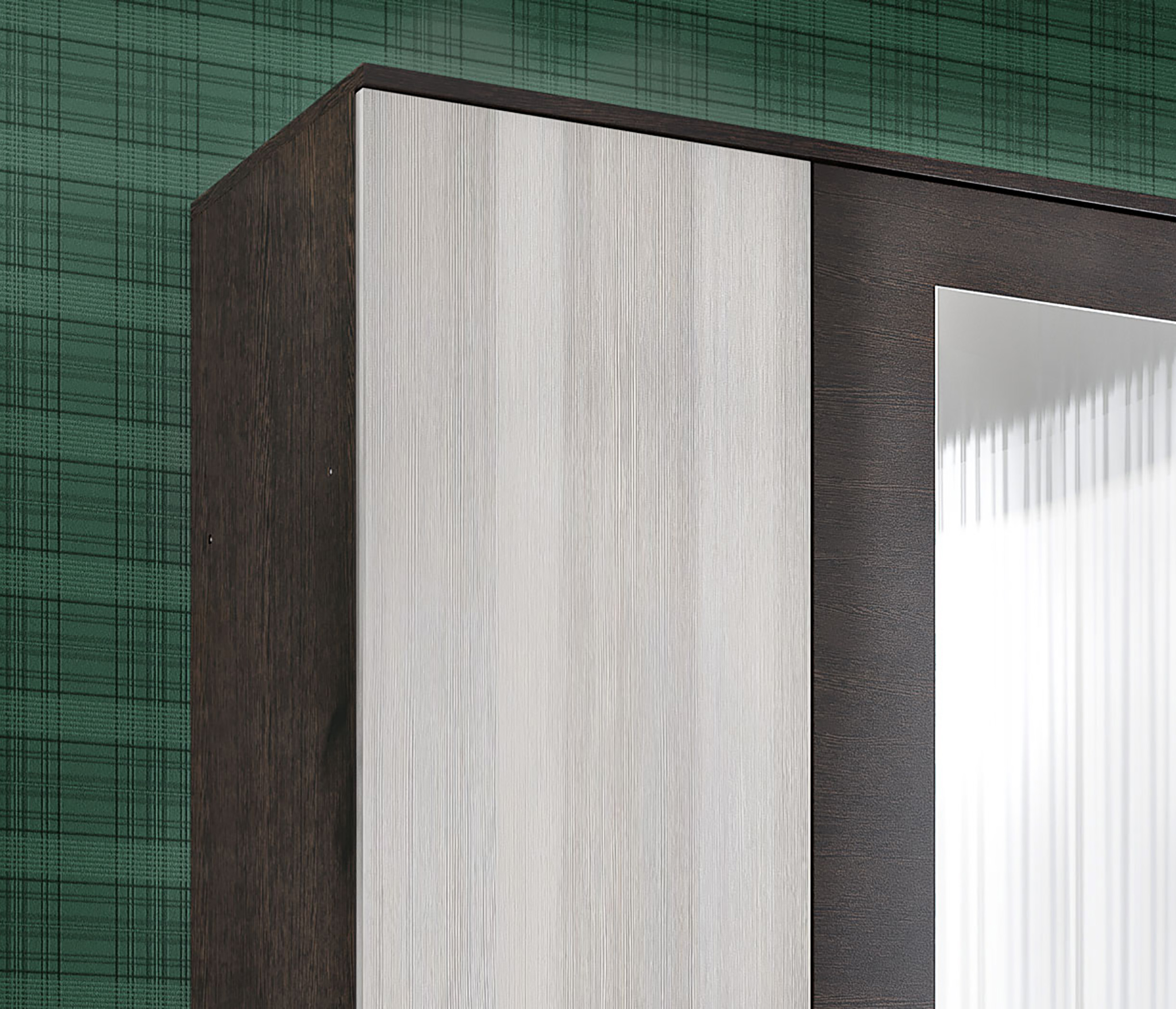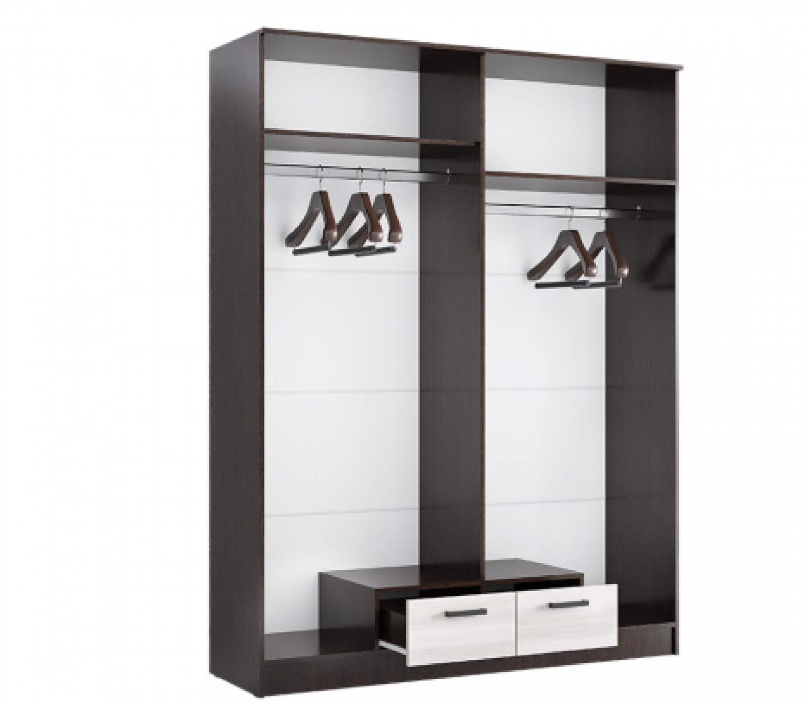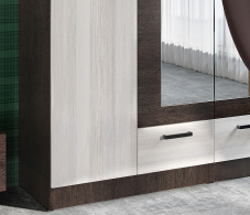 Распашной шкаф Адель включает две продольные штанги для плечиков, а также два выдвижных ящика для белья и аксессуаров. Два зеркала в полный рост.