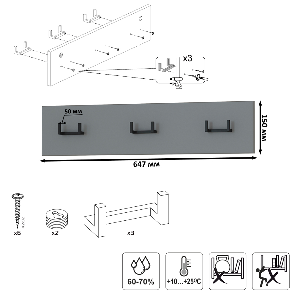 Состоит из трех модулей - три вешалки Октава 15.14.02, объединенных в единый блок. Каждая настенная вешалка представляет из себя панель из МДФ с тремя двухрожковыми крючками. В комплекте вешалки имеются скрытые крепления к стене. Максимальная нагрузка на каждый крючок составляет 1,5 кг.