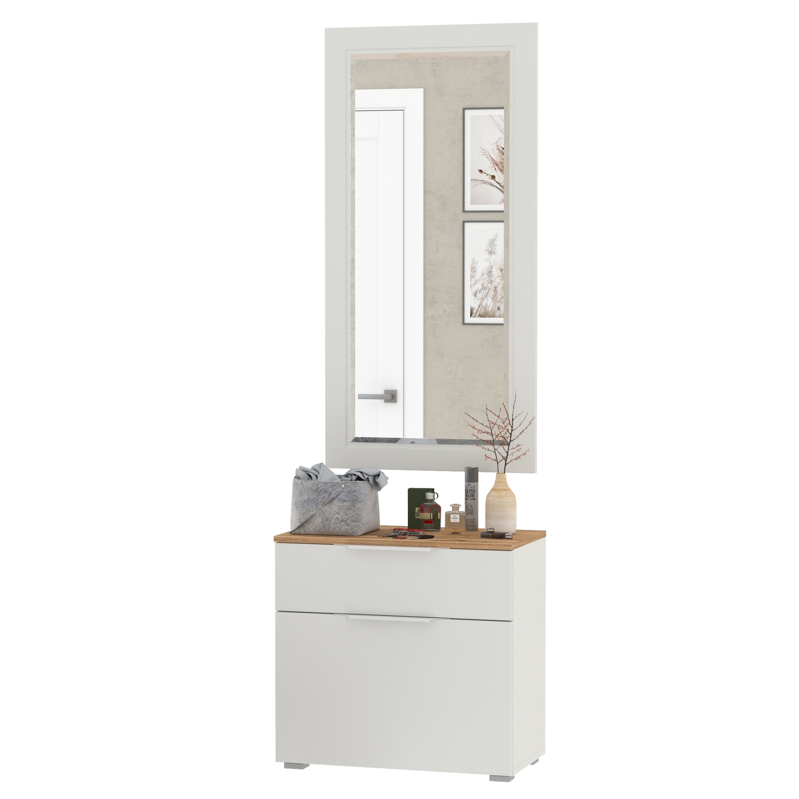 Сдержанный облик и компактная глубина сочетается с продуманным наполнением. Состоит из двух модулей - тумбы для обуви Октава 16.127 и зеркала Остин 17.03.. Аккуратная тумба для обуви с выдвижным ящиком для мелочей сверху и нишей с откидной дверкой с полками для обуви снизу. Отделение с откидной дверкой с полками вмещает до 6 пар невысокой обуви. Шариковые направляющие полного выдвижения обеспечивают тихую эксплуатацию выдвижного ящика. Металлические ручки выполнены из алюминиевого профиля надежно крепятся и удобно ложатся в руку. Визуально может показаться, что мебель без ручек. Такая видимость создается из-за того, что профиль крепится к торцовой части дверей и ящика. Прямоугольное навесное зеркало Остин 17.03 на панели из МДФ. Согласно Ваших запросов при установке зеркало возможно повесить как горизонтально, так и вертикально. Размер зеркала позволяет ему стать частью множества композиций. Зеркало Остин 17.03 имеет декоративный скос фаски под углом по всему периметру полотна. Скрытые крепежи на задней поверхности и предусматривают выбор расположения зеркала. Обувница оснащена пластиковыми опорами серого цвета.