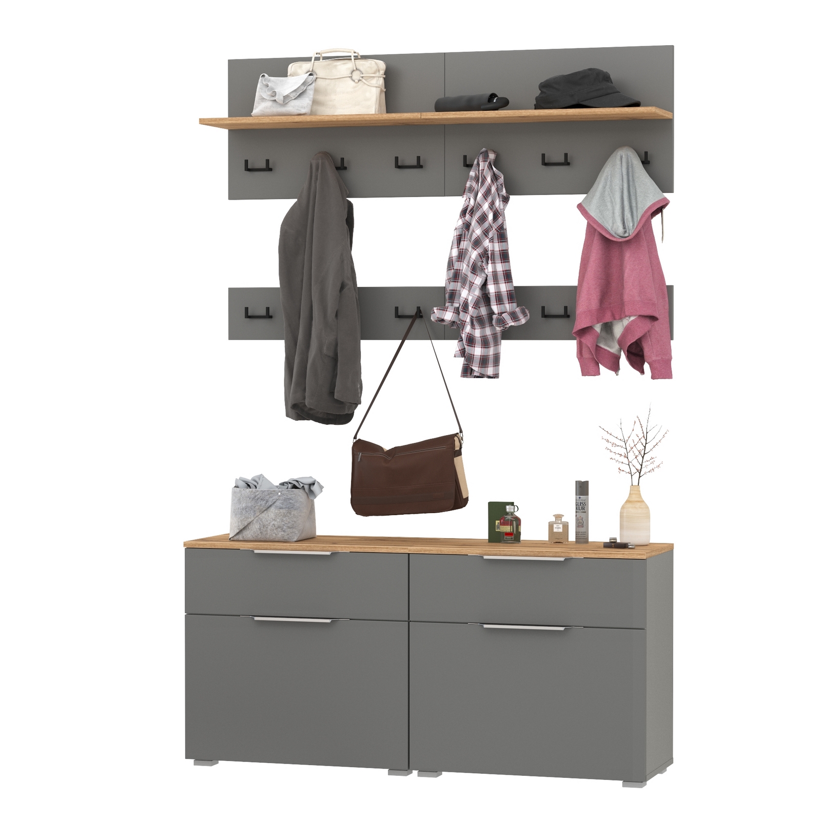Сдержанный облик и компактная глубина сочетается с продуманным наполнением. Комплектация состоит из шести модулей - двух тумб для обуви Октава 16.127, двух вешалок Октава 15.14.02 и двух вешалок Октава 15.14.01. Тумба для обуви Октава 16.127 (в комплектации 2 единицы) с выдвижным ящиком для мелочей сверху и нишей с откидной дверкой с полками для обуви снизу. Отделения с откидными дверками с полками вмещают до 12 пар невысокой обуви. Шариковые направляющие полного выдвижения. Металлические ручки выполнены из алюминиевого профиля надежно крепятся и удобно ложатся в руку. Визуально может показаться, что мебель без ручек. Такая видимость создается из-за того, что профиль крепится к торцовой части дверей и ящика. Вешалка Октава 15.14.01 (в комплектации 2 единицы) представляет из себя панель из МДФ с полкой для головных уборов с тремя двухрожковыми крючками под ней. Максимальная нагрузка на полку составляет 3 кг, на каждый крючок - 1,5 кг. Вешалка Октава 15.14.02 (в комплектации 2 единицы) представляет из себя панель из МДФ с тремя двухрожковыми крючками. Максимальная нагрузка на каждый крючок составляет 1,5 кг. Вешалки объединены и имеют 12 крючков для одежды. В комплекте вешалок имеются скрытые крепления к стене. Мебель оснащена пластиковыми опорами серого цвета.