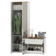 Сдержанный облик и компактная глубина сочетается с продуманным наполнением. Комплектация состоит из двух модулей - шкафа для одежды Октава 13.338 и тумбы для обуви Октава 16.127. Тумба для обуви Октава 16.127 с выдвижным ящиком для мелочей сверху и нишей с откидной дверкой с полками для обуви снизу. Отделение с откидной дверкой с полками вмещает до 6 пар невысокой обуви. Шариковые направляющие полного выдвижения обеспечивают тихую эксплуатацию выдвижного ящика. Двухдверный шкаф за распашными дверками которого расположены антресольная полка для головных уборов, выдвижная штанга для одежды на плечиках и две полки и ниша снизу. Зеркальные створки шкафа визуально расширяют пространство, а минималистичные алюминиевые ручки подчеркивают легкость и простоту линий. Максимальная нагрузка на каждую полку составляет 8 кг. Металлические ручки выполнены из алюминиевого профиля надежно крепятся и удобно ложатся в руку. Визуально может показаться, что мебель без ручек. Такая видимость создается из-за того, что профиль крепится к торцовой части дверей и ящика. Мебель оснащена пластиковыми опорами серого цвета.