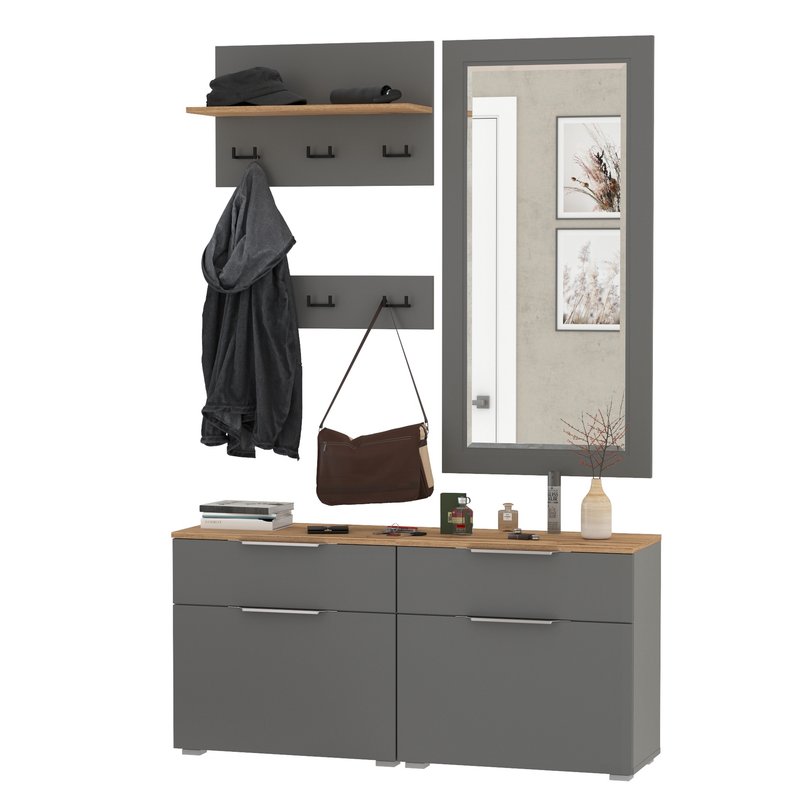 Сдержанный облик и компактная глубина сочетается с продуманным наполнением. Комплектация состоит из пяти модулей - двух тумб для обуви Октава 16.127, вешалки Октава 15.14.02, вешалки Октава 15.14.01 и зеркала Остин 17.03. Тумба для обуви Октава 16.127 (в комплектации 2 единицы) с выдвижным ящиком для мелочей сверху и нишей с откидной дверкой с полками для обуви снизу. Отделения с откидными дверками с полками вмещают до 12 пар невысокой обуви. Шариковые направляющие полного выдвижения. Металлические ручки выполнены из алюминиевого профиля надежно крепятся и удобно ложатся в руку. Визуально может показаться, что мебель без ручек. Такая видимость создается из-за того, что профиль крепится к торцовой части дверей и ящика. Вешалка Октава 15.14.01 представляет из себя панель из МДФ с полкой для головных уборов с тремя двухрожковыми крючками под ней. Максимальная нагрузка на полку составляет 3 кг, на каждый крючок - 1,5 кг. Вешалка Октава 15.14.02 представляет из себя панель из МДФ с тремя двухрожковыми крючками. Вешалки объединены и имеют 6 крючков для одежды. В комплекте вешалок имеются скрытые крепления к стене. Максимальная нагрузка на каждый крючок составляет 1,5 кг. Прямоугольное навесное зеркало Остин 17.03 на панели из МДФ. Согласно Ваших запросов при установке зеркало возможно повесить как горизонтально, так и вертикально. Размер зеркала позволяет ему стать частью множества композиций. Зеркало Остин 17.03 имеет декоративный скос фаски под углом по всему периметру полотна. Скрытые крепежи на задней поверхности и предусматривают выбор расположения зеркала. Мебель оснащена пластиковыми опорами серого цвета.