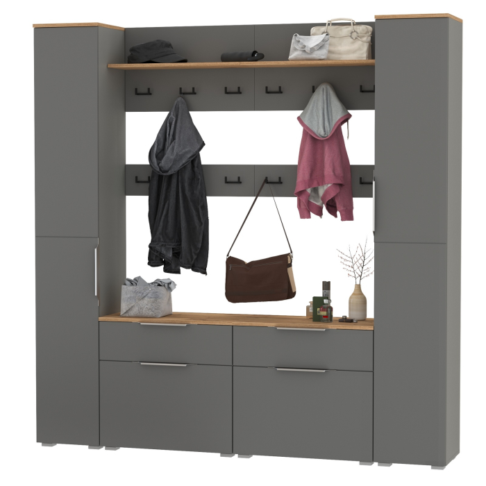 Сдержанный облик и компактная глубина сочетается с продуманным наполнением. Комплектация состоит из восьми модулей - двух пеналов Октава 13.228, двух тумб для обуви Октава 16.127, двух вешалок Октава 15.14.02 и двух вешалок Октава 15.14.01. Тумба для обуви Октава 16.127 (в комплектации 2 единицы) с выдвижным ящиком для мелочей сверху и нишей с откидной дверкой с полками для обуви снизу. Отделения с откидными дверками с полками вмещают до 12 пар невысокой обуви. Шариковые направляющие полного выдвижения обеспечивают тихую эксплуатацию выдвижных ящиков. Вешалка Октава 15.14.01 (в комплектации 2 единицы) представляет из себя панель из МДФ с полкой для головных уборов с тремя двухрожковыми крючками под ней. Максимальная нагрузка на полку составляет 3 кг, на каждый крючок - 1,5 кг. Вешалка Октава 15.14.02 (в комплектации 2 единицы) представляет из себя панель из МДФ с тремя двухрожковыми крючками. Максимальная нагрузка на каждый крючок составляет 1,5 кг. Вешалки объединены и имеют 12 крючков для одежды. В комплекте вешалок имеются скрытые крепления к стене. За распашной каждого дверкой пенала Октава 13.228 (в комплектации 2 единицы) расположены 5 полок из ЛДСП для размещения Ваших головных уборов и обуви. Универсальная сборка - сторону открывания двери Вы определяете при сборке. Максимальная нагрузка на каждую полку составляет 8 кг. Металлические ручки выполнены из алюминиевого профиля надежно крепятся и удобно ложатся в руку. Визуально может показаться, что мебель без ручек. Такая видимость создается из-за того, что профиль крепится к торцовой части дверей и ящика. Мебель оснащена пластиковыми опорами серого цвета.