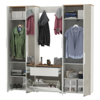 Сдержанный облик и компактная глубина сочетается с продуманным наполнением. Комплектация состоит из четырех модулей - двух шкафов для одежды Октава 13.338, тумбы для обуви Октава 16.127 и вешалки Октава 15.14.02. Тумба для обуви Октава 16.127 с выдвижным ящиком для мелочей сверху и нишей с откидной дверкой с полками для обуви снизу. Отделение с откидной дверкой с полками вмещает до 6 пар невысокой обуви. Шариковые направляющие полного выдвижения обеспечивают тихую эксплуатацию выдвижного ящика. Вешалка Октава 15.14.02 представляет из себя панель из МДФ с тремя двухрожковыми крючками. В комплекте вешалки имеются скрытые крепления к стене. Максимальная нагрузка на каждый крючок составляет 1,5 кг. Двухдверный шкаф (в комплектации 2 единицы) за распашными дверками которого расположены антресольная полка для головных уборов, выдвижная штанга для одежды на плечиках и две полки и ниша снизу. Зеркальные створки шкафа визуально расширяют пространство, а минималистичные алюминиевые ручки подчеркивают легкость и простоту линий. Максимальная нагрузка на каждую полку составляет 8 кг. Металлические ручки выполнены из алюминиевого профиля надежно крепятся и удобно ложатся в руку. Визуально может показаться, что мебель без ручек. Такая видимость создается из-за того, что профиль крепится к торцовой части дверей и ящика. Мебель оснащена пластиковыми опорами серого цвета.