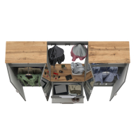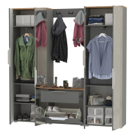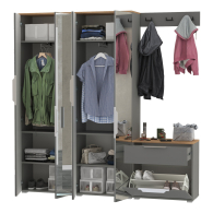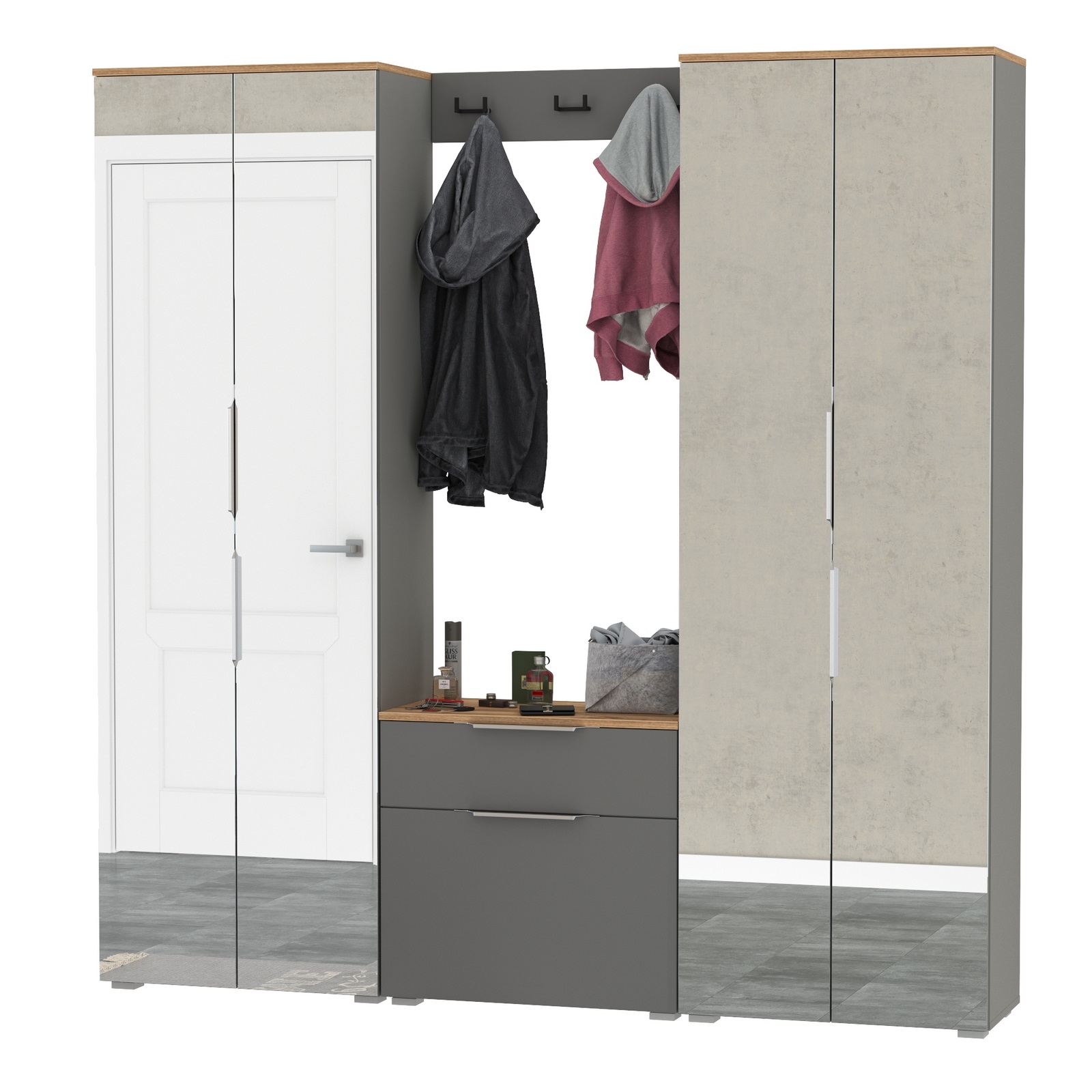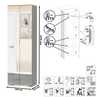 Сдержанный облик и компактная глубина сочетается с продуманным наполнением. Комплектация состоит из четырех модулей - двух шкафов для одежды Октава 13.338, тумбы для обуви Октава 16.127 и вешалки Октава 15.14.02. Тумба для обуви Октава 16.127 с выдвижным ящиком для мелочей сверху и нишей с откидной дверкой с полками для обуви снизу. Отделение с откидной дверкой с полками вмещает до 6 пар невысокой обуви. Шариковые направляющие полного выдвижения обеспечивают тихую эксплуатацию выдвижного ящика. Вешалка Октава 15.14.02 представляет из себя панель из МДФ с тремя двухрожковыми крючками. В комплекте вешалки имеются скрытые крепления к стене. Максимальная нагрузка на каждый крючок составляет 1,5 кг. Двухдверный шкаф (в комплектации 2 единицы) за распашными дверками которого расположены антресольная полка для головных уборов, выдвижная штанга для одежды на плечиках и две полки и ниша снизу. Зеркальные створки шкафа визуально расширяют пространство, а минималистичные алюминиевые ручки подчеркивают легкость и простоту линий. Максимальная нагрузка на каждую полку составляет 8 кг. Металлические ручки выполнены из алюминиевого профиля надежно крепятся и удобно ложатся в руку. Визуально может показаться, что мебель без ручек. Такая видимость создается из-за того, что профиль крепится к торцовой части дверей и ящика. Мебель оснащена пластиковыми опорами серого цвета.