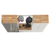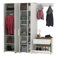 Сдержанный облик и компактная глубина сочетается с продуманным наполнением. Комплектация состоит из пяти модулей - шкафа для одежды Октава 13.338, двух пеналов Октава 13.228, тумбы для обуви Октава 16.127 и вешалки Октава 15.14.02. Тумба для обуви Октава 16.127 с выдвижным ящиком для мелочей сверху и нишей с откидной дверкой с полками для обуви снизу. Отделение с откидной дверкой с полками вмещает до 6 пар невысокой обуви. Шариковые направляющие полного выдвижения обеспечивают тихую эксплуатацию выдвижного ящика. Вешалка Октава 15.14.02 представляет из себя панель из МДФ с тремя двухрожковыми крючками. В комплекте вешалки имеются скрытые крепления к стене. Максимальная нагрузка на каждый крючок составляет 1,5 кг. За распашной каждого дверкой пенала Октава 13.228 (в комплектации 2 единицы) расположены 5 полок из ЛДСП для размещения Ваших головных уборов и обуви. Универсальная сборка - сторону открывания двери Вы определяете при сборке. Двухдверный шкаф за распашными дверками которого расположены антресольная полка для головных уборов, выдвижная штанга для одежды на плечиках и две полки и ниша снизу. Зеркальные створки шкафа визуально расширяют пространство, а минималистичные алюминиевые ручки подчеркивают легкость и простоту линий. Максимальная нагрузка на каждую полку составляет 8 кг. Металлические ручки выполнены из алюминиевого профиля надежно крепятся и удобно ложатся в руку. Визуально может показаться, что мебель без ручек. Такая видимость создается из-за того, что профиль крепится к торцовой части дверей и ящика. Мебель оснащена пластиковыми опорами серого цвета.