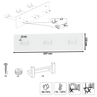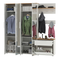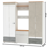 Сдержанный облик и компактная глубина сочетается с продуманным наполнением. Комплектация состоит из пяти модулей - двух шкафов для одежды Октава 13.338, тумбы для обуви Октава 16.127, вешалки Октава 15.14.02 и вешалки Октава 15.14.01. Тумба для обуви Октава 16.127 с выдвижным ящиком для мелочей сверху и нишей с откидной дверкой с полками для обуви снизу. Отделение с откидной дверкой с полками вмещает до 6 пар невысокой обуви. Шариковые направляющие полного выдвижения обеспечивают тихую эксплуатацию выдвижного ящика. Вешалка Октава 15.14.01 представляет из себя панель из МДФ с полкой для головных уборов с тремя двухрожковыми крючками под ней. Максимальная нагрузка на полку составляет 3 кг, на каждый крючок - 1,5 кг. Вешалка Октава 15.14.02 представляет из себя панель из МДФ с тремя двухрожковыми крючками. Максимальная нагрузка на каждый крючок составляет 1,5 кг. Вешалки объединены и имеют 6 крючков для одежды. В комплекте вешалок имеются скрытые крепления к стене. Двухдверный шкаф (в комплектации 2 единицы) за распашными дверками которого расположены антресольная полка для головных уборов, выдвижная штанга для одежды на плечиках и две полки и ниша снизу. Зеркальные створки шкафа визуально расширяют пространство, а минималистичные алюминиевые ручки подчеркивают легкость и простоту линий. Максимальная нагрузка на каждую полку составляет 8 кг. Металлические ручки выполнены из алюминиевого профиля надежно крепятся и удобно ложатся в руку. Визуально может показаться, что мебель без ручек. Такая видимость создается из-за того, что профиль крепится к торцовой части дверей и ящика. Мебель оснащена пластиковыми опорами серого цвета.