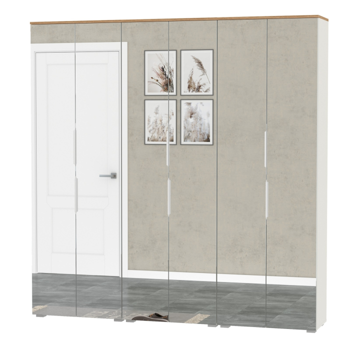 Сдержанный облик и компактная глубина сочетается с продуманным наполнением. Комплектация состоит из трех модулей - трёх шкафов для одежды Октава 13.338. Двухдверный шкаф (в комплектации 3 единицы) за распашными дверками которого расположены антресольная полка для головных уборов, выдвижная штанга для одежды на плечиках и две полки и ниша снизу. Зеркальные створки шкафа визуально расширяют пространство, а минималистичные алюминиевые ручки подчеркивают легкость и простоту линий. Максимальная нагрузка на каждую полку составляет 8 кг. Металлические ручки выполнены из алюминиевого профиля надежно крепятся и удобно ложатся в руку. Визуально может показаться, что мебель без ручек. Такая видимость создается из-за того, что профиль крепится к торцовой части дверей, дополняя общюю композицию. Мебель оснащена пластиковыми опорами серого цвета.