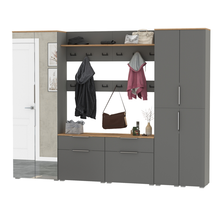 Сдержанный облик и компактная глубина сочетается с продуманным наполнением. Комплектация состоит из девяти модулей - шкафа для одежды Октава 13.338, двух пеналов Октава 13.228, двух тумб для обуви Октава 16.127, двух вешалок Октава 15.14.02 и двух вешалок Октава 15.14.01. Тумба для обуви Октава 16.127 (в комплектации 2 единицы) с выдвижным ящиком для мелочей сверху и нишей с откидной дверкой с полками для обуви снизу. Отделения с откидными дверками с полками вмещают до 12 пар невысокой обуви. Шариковые направляющие полного выдвижения. Вешалка Октава 15.14.01 (в комплектации 2 единицы) представляет из себя панель из МДФ с полкой для головных уборов с тремя двухрожковыми крючками под ней. Максимальная нагрузка на полку составляет 3 кг, на каждый крючок - 1,5 кг. Вешалка Октава 15.14.02 (в комплектации 2 единицы) представляет из себя панель из МДФ с тремя двухрожковыми крючками. Максимальная нагрузка на каждый крючок составляет 1,5 кг. Вешалки объединены и имеют 12 крючков для одежды. В комплекте вешалок имеются скрытые крепления к стене. За распашной дверкой пенала Октава 13.228 (в комплектации 2 единицы) расположены 5 полок из ЛДСП для размещения Ваших головных уборов и обуви. Универсальная сборка - сторону открывания дверей Вы определяете при сборке. Такая видимость создается из-за того, что профиль крепится к торцовой части дверей дополняя общюю композицию. Двухдверный шкаф за распашными дверками которого расположены антресольная полка для головных уборов, выдвижная штанга для одежды на плечиках и две полки и ниша снизу. Зеркальные створки шкафа визуально расширяют пространство, а минималистичные алюминиевые ручки подчеркивают легкость и простоту линий. Максимальная нагрузка на каждую полку составляет 8 кг. Металлические ручки выполнены из алюминиевого профиля надежно крепятся и удобно ложатся в руку. Визуально может показаться, что мебель без ручек. Такая видимость создается из-за того, что профиль крепится к торцовой части дверей и ящика. Мебель оснащена пластиковыми опорами серого цвета.