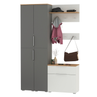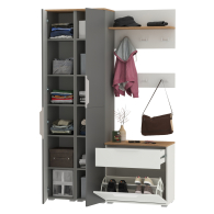Сдержанный облик и компактная глубина сочетается с продуманным наполнением. Комплектация состоит из пяти модулей - двух пеналов Октава 13.228, тумбы для обуви Октава 16.127, вешалки Октава 15.14.02 и вешалки Октава 15.14.01. Тумба для обуви Октава 16.127 с выдвижным ящиком для мелочей сверху и нишей с откидной дверкой с полками для обуви снизу. Отделение с откидной дверкой с полками вмещает до 6 пар невысокой обуви. Шариковые направляющие полного выдвижения обеспечивают тихую эксплуатацию выдвижного ящика. Вешалка Октава 15.14.01 представляет из себя панель из МДФ с полкой для головных уборов с тремя двухрожковыми крючками под ней. Максимальная нагрузка на полку составляет 3 кг, на каждый крючок - 1,5 кг. Вешалка Октава 15.14.02 представляет из себя панель из МДФ с тремя двухрожковыми крючками. Максимальная нагрузка на каждый крючок составляет 1,5 кг. Вешалки объединены и имеют 6 крючков для одежды. В комплекте вешалок имеются скрытые крепления к стене. За распашной каждого дверкой пенала Октава 13.228 (в комплектации 2 единицы) расположены 5 полок из ЛДСП для размещения Ваших головных уборов и обуви. Универсальная сборка - сторону открывания двери Вы определяете при сборке. Максимальная нагрузка на каждую полку составляет 8 кг. Металлические ручки выполнены из алюминиевого профиля надежно крепятся и удобно ложатся в руку. Визуально может показаться, что мебель без ручек. Такая видимость создается из-за того, что профиль крепится к торцовой части дверей и ящика. Мебель оснащена пластиковыми опорами серого цвета.