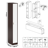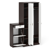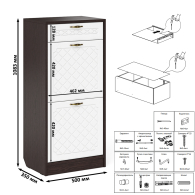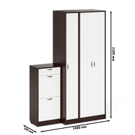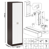 Комплектация состоит из шкафа для одежды и пенала объединенных в единый блок и высокой обувницы. Классический шкаф за распашными дверками которого расположены антресольная полка для головных уборов, горизонтальная штанка и нижняя ниша для обуви. Классический узкий пенал, за распашной дверью которого расположены 4 полки. Сторону открывания двери Вы определяете при сборке, что расширяет возможности удобной меблировки прихожей. Высокая обувница оборудована ящиком для мелочей сверцу и двумя отделениями с откидными фасадами для обуви. Для фиксации откидных фасадов используется газлифт мебельный. Максимальная нагрузка составляет 5 кг.