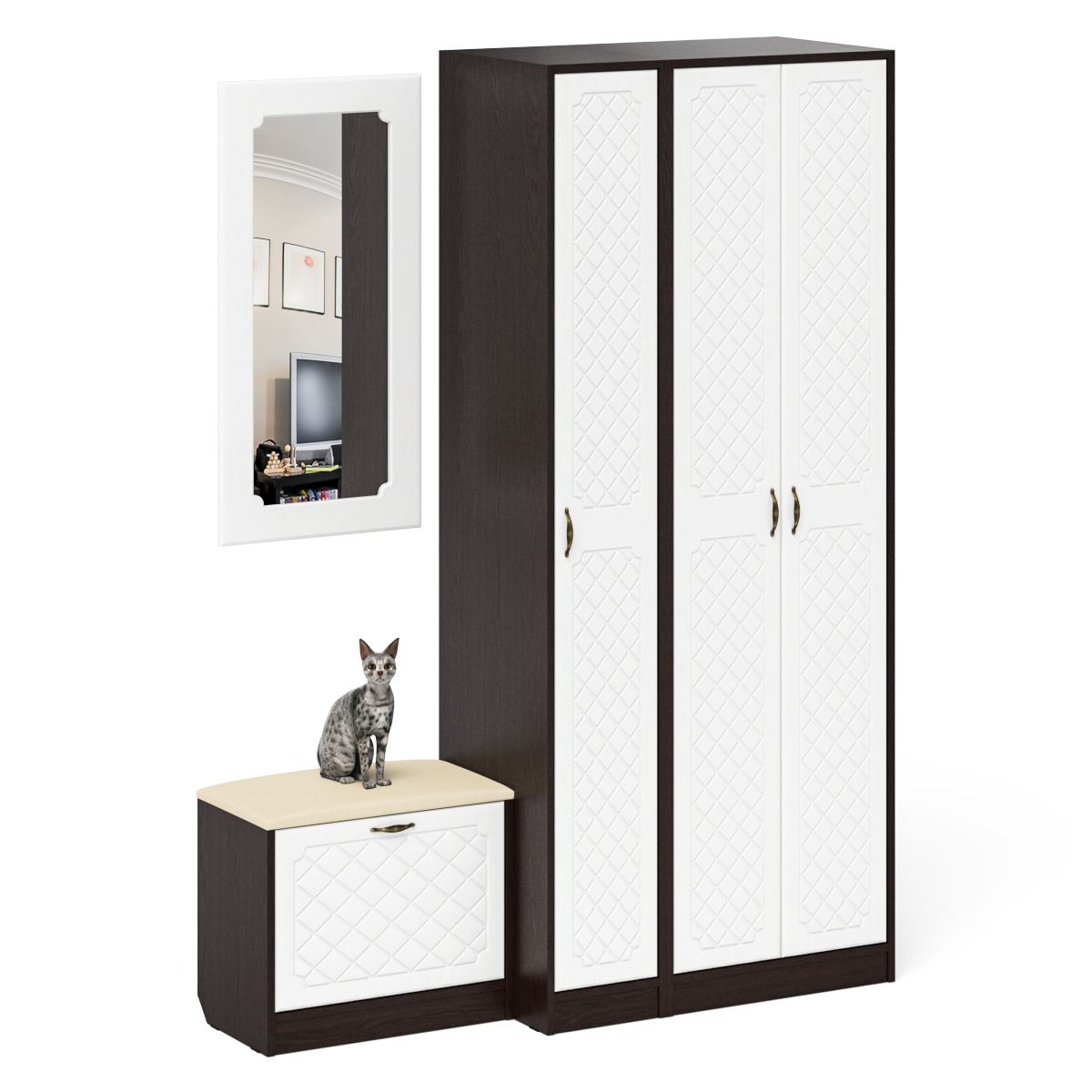 Комплектация состоит из шкафа для одежды и пенала объединенных в единый блок, тумбы с сиденьем и навесного зеркала. Классический шкаф за распашными дверками которого расположены антресольная полка для головных уборов, горизонтальная штанка и нижняя ниша для обуви. Классический узкий пенал, за распашной дверью которого расположены 4 полки. Сторону открывания двери Вы определяете при сборке, что расширяет возможности удобной меблировки прихожей. Компактная маленькая обувница без полок за откидной дверкой. За откидной дверцей достаточно места для нескольких пар обуви. Обувница оборудована мягким сиденьем - ее можно использовать в качестве банкетки с комфортом обуваясь перед выходом. Для фиксации откидных фасадов используется газлифт мебельный. Максимальная нагрузка составляет 5 кг. Классическое прямоугольное зеркало в раме из МДФ. Крепления вешалки и зеркала к стене в комплектацию не входит.