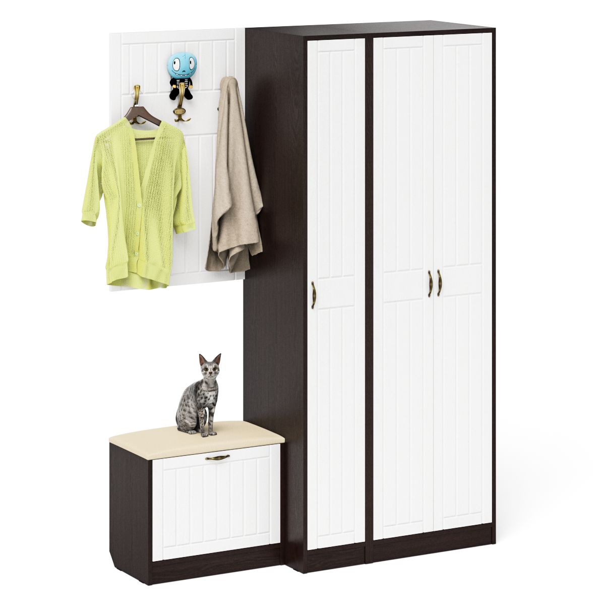 Комплектация состоит из шкафа для одежды и пенала объединенных в единый блок, тумбы с сиденьем и навесной вешалки. Классический шкаф за распашными дверками которого расположены антресольная полка для головных уборов, горизонтальная штанка и нижняя ниша для обуви. Классический узкий пенал, за распашной дверью которого расположены 4 полки. Сторону открывания двери Вы определяете при сборке, что расширяет возможности удобной меблировки прихожей. Компактная маленькая обувница без полок за откидной дверкой. За откидной дверцей достаточно места для нескольких пар обуви. Обувница оборудована мягким сиденьем - ее можно использовать в качестве банкетки с комфортом обуваясь перед выходом. Для фиксации откидных фасадов используется газлифт мебельный. Максимальная нагрузка составляет 5 кг. Классическая прямоугольная настенная вешалка с крючками. Оборудована тремя трехрожковыми крючками для одежды. Глубина вешалки - 16 мм., 9,3 см. - это глубина с учетом крючков. Крепления вешалки к стене в комплектацию не входит.