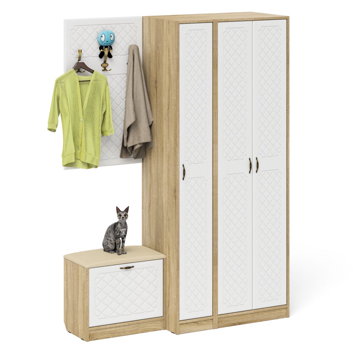 Комплектация состоит из шкафа для одежды и пенала объединенных в единый блок, тумбы с сиденьем и навесной вешалки. Классический шкаф за распашными дверками которого расположены антресольная полка для головных уборов, горизонтальная штанка и нижняя ниша для обуви. Классический узкий пенал, за распашной дверью которого расположены 4 полки. Сторону открывания двери Вы определяете при сборке, что расширяет возможности удобной меблировки прихожей. Компактная маленькая обувница без полок за откидной дверкой. За откидной дверцей достаточно места для нескольких пар обуви. Обувница оборудована мягким сиденьем - ее можно использовать в качестве банкетки с комфортом обуваясь перед выходом. Для фиксации откидных фасадов используется газлифт мебельный. Максимальная нагрузка составляет 5 кг. Классическая прямоугольная настенная вешалка с крючками. Оборудована тремя трехрожковыми крючками для одежды. Глубина вешалки - 16 мм., 9,3 см. - это глубина с учетом крючков. Крепления вешалки к стене в комплектацию не входит.