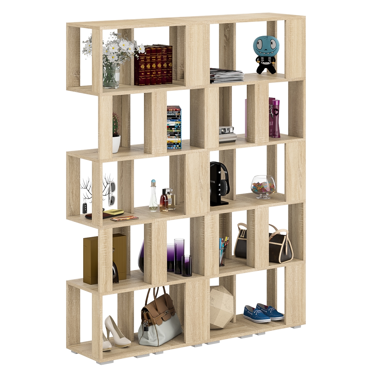 Комплект их четырех стеллажей, объединенных в единый блок, визуально максимально легкая с прекрасным доступом к каждой полечке, идеально подойдет и для книг и журналов и как стенд для поделок Вашего ребенка. Комплект конструктивно представляет из себя 5 ярусов с четырьмя полочками с доступом с четырех сторон. Комплект установлен на пластиковые опоры высотой 20 мм, защищающие покрытие пола от повреждений.