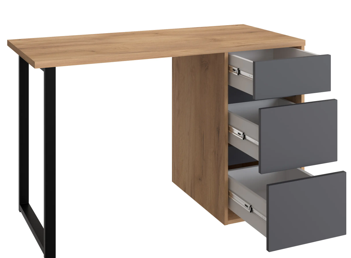 Стол письменный С-401 позволит создать комфортное и стильное рабочее пространство в офисе или домашнем кабинете. Стол С-401 можно использовать в качестве маникюрного стола. Стол имеет прочную стальную опору и тумбу с тремя выдвижными ящиками. Столешница изготовлена из ЛДСП 25 мм. Стол может быть собран в зеркальном варианте «правым» или «левым». Фурнитура: телескопический направляющие полного выдвижения без доводчиков, опора металл.
