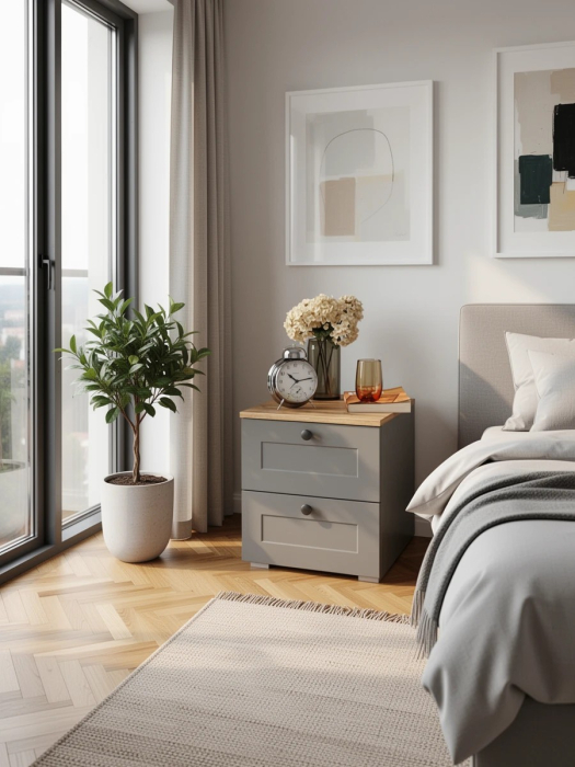 Тумба прикроватная с двумя выдвижными ящиками для хранения различных принадлежностей и мелких предметов. Скрытые направляющие выдвижных ящиков предназначены для обеспечения мягкого и плавного закрывания. Эти направляющие интегрированы таким образом, что они незаметны с внешней стороны, обеспечивая эстетичный внешний вид и комфортное использование мебели. Тумба оснащена регулируемыми опорами, выполненными из серого пластика.