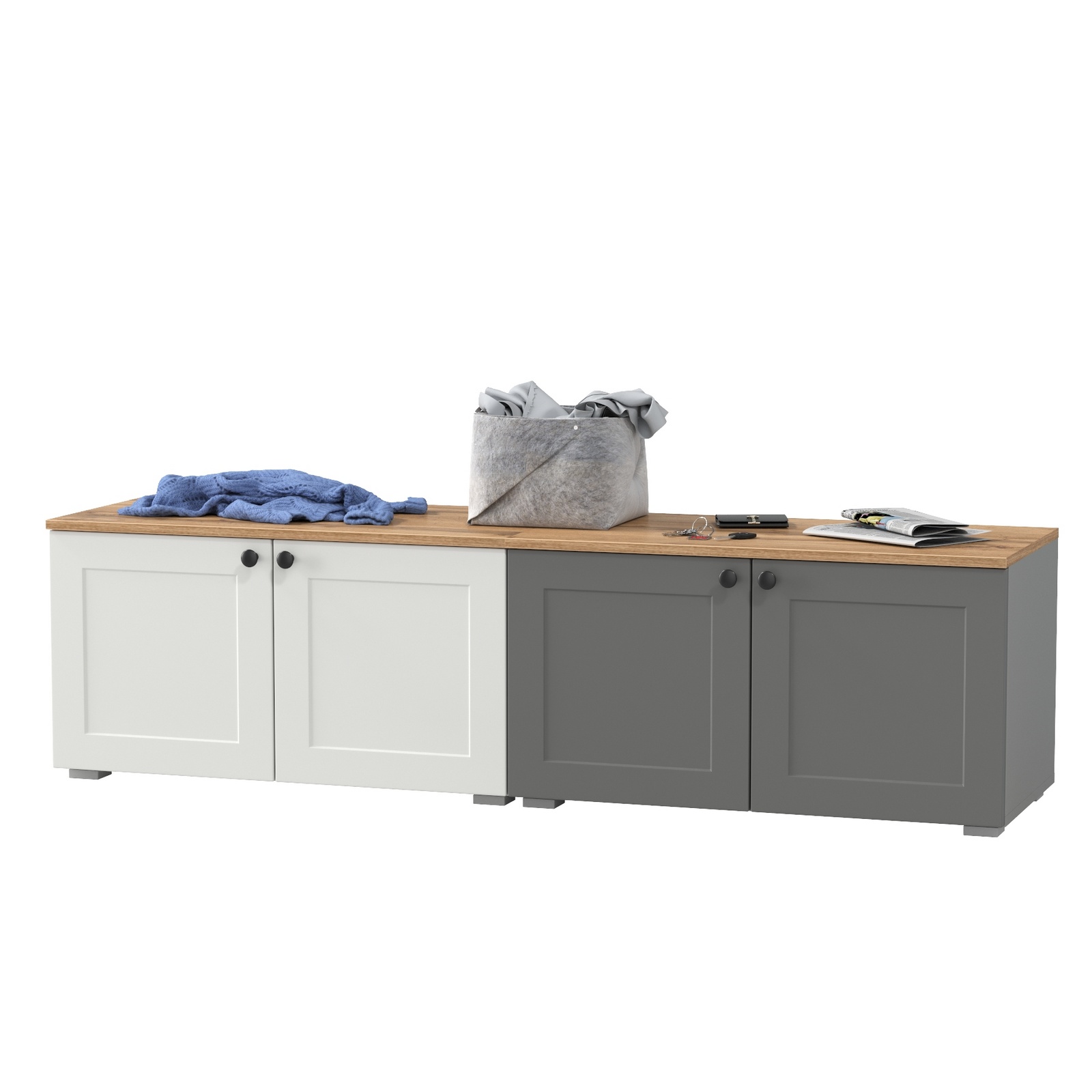 Выполнена в 3-х цветах: белый шагрень/дуб крафт золотой, серый графит/дуб крафт золотой и белый шагрень/серый графит/дуб крафт золотой.