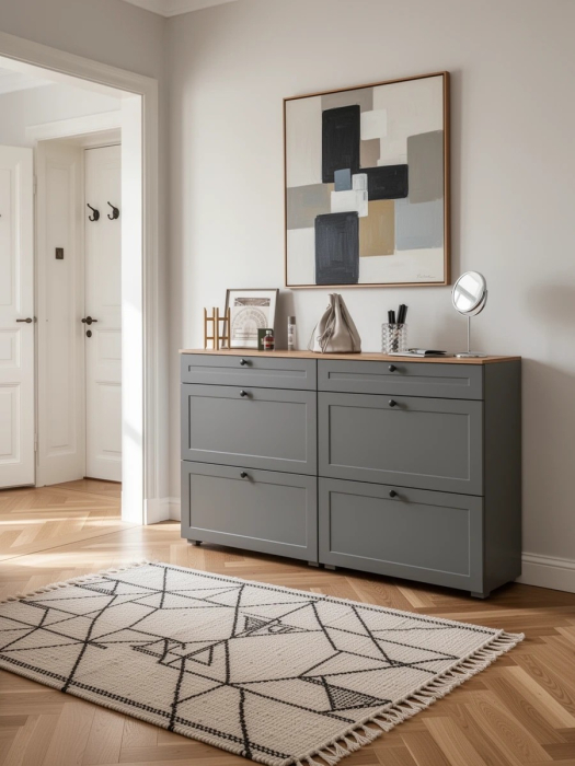 Комплектация состоит из двух тумб для обуви Остин 16.121. Каждая тумба с выдвижным ящиком и 2 откидными дверками с полками для 12 пар обуви снизу. Всего - 24 пары обуви. Каждая откидная дверь расчитана для хранения и размещения 6 пар невысокой обуви, что обеспечивает удобство и порядок в Вашей прихожей. Максимальная нагрузка на каждую полку и ящик - 3 кг. Скрытые направляющие выдвижных ящиков предназначены для обеспечения мягкого и плавного закрывания. Эти направляющие интегрированы таким образом, что они незаметны с внешней стороны, обеспечивая эстетичный внешний вид и комфортное использование мебели. Двери оснащены 4хшарнирными петлями без доводчиков, что обеспечивает простоту использования. Мебель оснащена регулируемыми опорами, выполненными из серого пластика. Лицевая фурнитура в виде черных аккуратных ручек. Изготовлена мебель из популярного материала - ламинированной ДСП 16 мм, торцы окромлены ПХВ плёнкой. Фасады выполнены из рамочного профиля из МДФ со вставками ДВПО с узором. Поставляется в разобранном виде, с комплектом фурнитуры, упакованная в 4-х слойный гофрокартон.