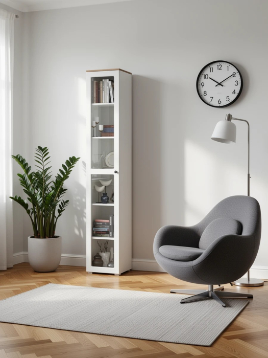 Узкий пенал-витрина с распашной дверью предлагает удивительные возможности хранения. Внутри Вы найдете пять несъемных полок, обеспечивающих компактное и удобное размещение ваших вещей. Максимальная нагрузка на каждую полку - 8 кг. Универсальная сборка двери - может быть установлена как на левую, так и на правую сторону. Двери оснащены 4хшарнирными петлями без доводчиков, что обеспечивает простоту использования. Мебель оснащена регулируемыми опорами, выполненными из серого пластика. Лицевая фурнитура в виде черных аккуратных ручек. Изготовлена мебель из популярного материала - ламинированной ДСП 16 мм, торцы окромлены ПХВ плёнкой. Фасады выполнены из рамочного профиля из МДФ со вставками из закаленного стекла. Поставляется в разобранном виде, с комплектом фурнитуры, упакованная в 4-х слойный гофрокартон.