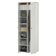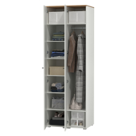 Комплектация состоит из двух пеналов Остин 13.225. Каждый пенал имеет распашную дверь и внутри расположено шесть полок. Максимальная нагрузка на каждую полку - 5 кг. Каждый шкаф-пенал имеет два варианта наполнения - 6 полок или штанга с антресольной и нижней полочками. 4 центральные полочки являются съемными и при необходимости, Вы оперативно можете переоборудовать пенал, установив штангу для одежды на плечиках. Универсальная сборка дверей - могут быть установлены как на левую, так и на правую сторону. Двери оснащены 4хшарнирными петлями без доводчиков, что обеспечивает простоту использования. Мебель оснащена регулируемыми опорами, выполненными из серого пластика. Лицевая фурнитура в виде черных аккуратных ручек. Изготовлена мебель из популярного материала - ламинированной ДСП 16 мм, торцы окромлены ПХВ плёнкой. Фасады выполнены из рамочного профиля из МДФ со вставками ДВПО с узором. Поставляется в разобранном виде, с комплектом фурнитуры, упакованная в 4-х слойный гофрокартон.