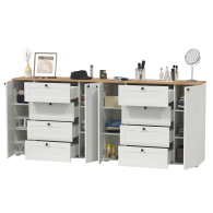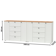 Комплектация состоит из двух комодов Остин 16.221. Каждый комод имеет три части - центральная - это 4 выдвижных ящика, по бокам расположены закрытые распашными дверками ниши с двумя полками в каждой. В комплектации 3 комода. В комоде предусмотрены съемные полки. Скрытые направляющие выдвижных ящиков. Двери оснащены 4хшарнирными петлями без доводчиков. Мебель оснащена регулируемыми опорами, выполненными из серого пластика. Лицевая фурнитура в виде черных аккуратных ручек. Изготовлена мебель из ЛДСП 16 мм, торцы окромлены ПХВ плёнкой. Фасады из рамочного профиля из МДФ со вставками ДВПО с узором. Поставляется в разобранном виде.