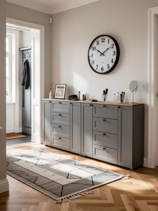 Комплектация состоит из двух комодов Остин 16.221. Каждый комод имеет три части - центральная - это 4 выдвижных ящика, по бокам расположены закрытые распашными дверками ниши с двумя полками в каждой. В комплектации 3 комода. В комоде предусмотрены съемные полки. Скрытые направляющие выдвижных ящиков. Двери оснащены 4хшарнирными петлями без доводчиков. Мебель оснащена регулируемыми опорами, выполненными из серого пластика. Лицевая фурнитура в виде черных аккуратных ручек. Изготовлена мебель из ЛДСП 16 мм, торцы окромлены ПХВ плёнкой. Фасады из рамочного профиля из МДФ со вставками ДВПО с узором. Поставляется в разобранном виде.
