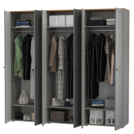 Комплектация состоит из трех шкафов Остин 13.224. Три шкафа объединены интегрированы в единое блок, обеспечивая практичное решение для организации хранения. Каждый шкаф с двумя распашными дверьми предлагает удобное решение для хранения вашей одежды и аксессуаров. В его верхней части устроена антресольная полка. Под ней горизонтальная штанга для одежды на плечиках, снизу полка и ниша. Макс. нагрузка на каждую полку - 5 кг. Двери оснащены 4хшарнирными петлями без доводчиков. Мебель оснащена регулируемыми опорами из серого пластика. Лицевая фурнитура в виде черных аккуратных ручек. Изготовлена мебель из ЛДСП 16 мм, торцы окромлены ПХВ плёнкой. Фасады из рамочного профиля из МДФ со вставками ДВПО с узором. Поставляется в разобранном виде.