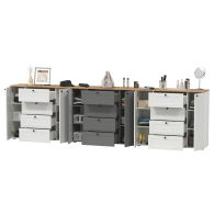 Выполнены в 3-х цветах: белый шагрень/дуб крафт золотой, серый графит/дуб крафт золотой и белый шагрень/серый графит/дуб крафт золотой.