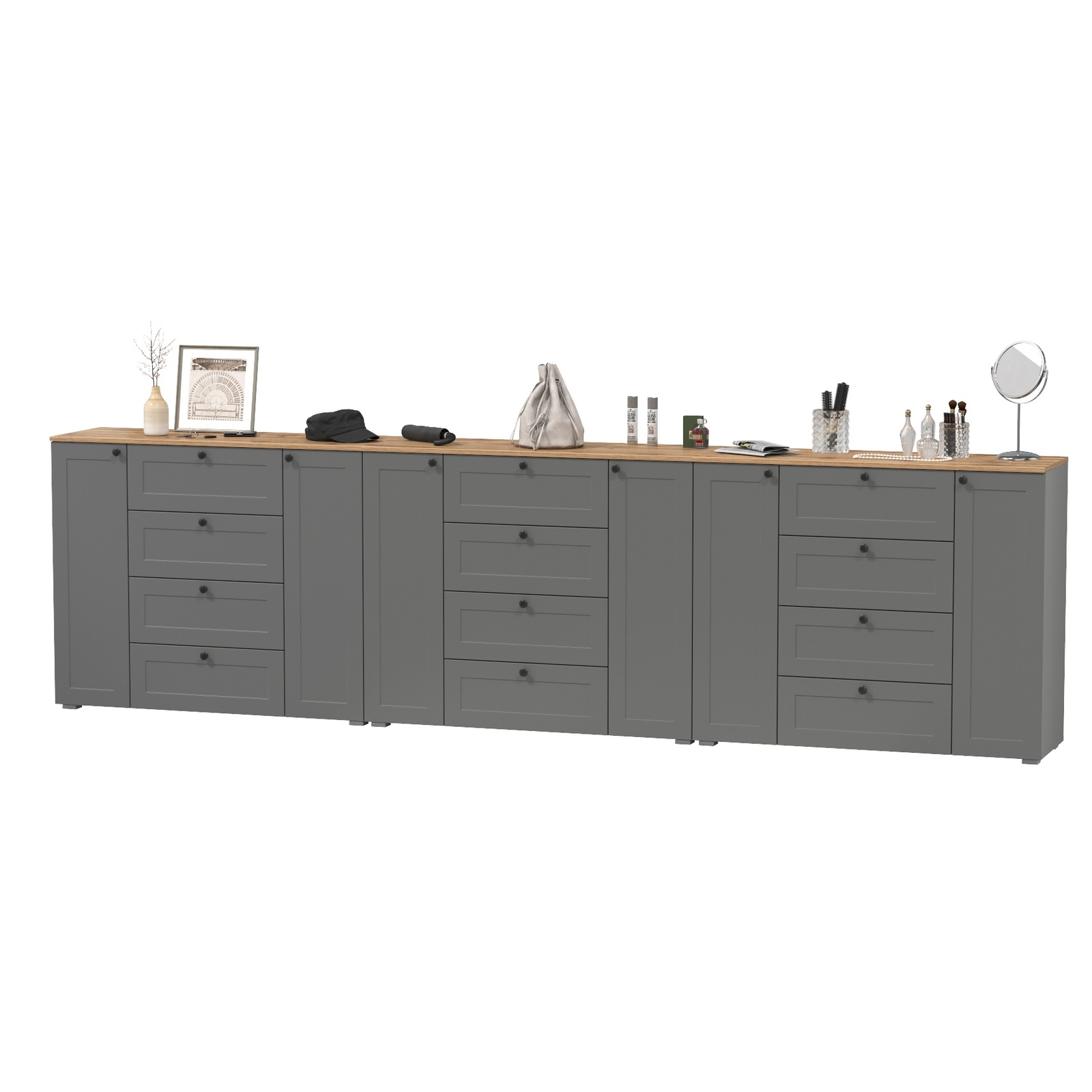 Комплектация состоит из трех комодов Остин 16.221. Каждый комод имеет три части - центральная - это 4 выдвижных ящика, по бокам расположены закрытые распашными дверками ниши с двумя полками в каждой. В комплектации 3 комода. В комоде предусмотрены съемные полки. Двери оснащены 4хшарнирными петлями без доводчиков. Мебель оснащена регулируемыми опорами из серого пластика. Лицевая фурнитура в виде черных аккуратных ручек. Изготовлена мебель из ЛДСП 16 мм, торцы окромлены ПХВ плёнкой. Фасады из рамочного профиля из МДФ со вставками ДВПО с узором. Поставляется в разобранном виде.