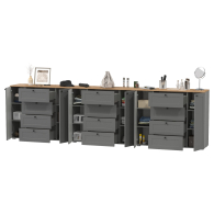 Выполнены в 3-х цветах: белый шагрень/дуб крафт золотой, серый графит/дуб крафт золотой и белый шагрень/серый графит/дуб крафт золотой.