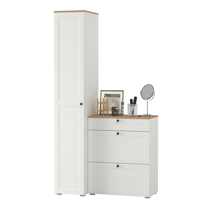 Комплектация состоит из пенала Остин 13.225 и тумбы для обуви Остин 16.121. Пенал имеет распашную дверь и внутри расположено шесть полок. Максимальная нагрузка на каждую полку - 5 кг. Пенал имеет два варианта наполнения - 6 полок или штанга с антресольной и нижней полочками. 4 центральные полочки являются съемными и при необходимости, Вы оперативно можете переоборудовать пенал, установив штангу для одежды на плечиках. Универсальная сборка двери - может быть установлена как на левую, так и на правую сторону. Тумба с выдвижным ящиком и 2 откидными дверками с полками для 12 пар обуви снизу. Каждая откидная дверь расчитана для хранения и размещения 6 пар невысокой обуви, что обеспечивает удобство и порядок в Вашей прихожей. Максимальная нагрузка на каждую полку и ящик - 3 кг. Скрытые направляющие выдвижных ящиков предназначены для обеспечения мягкого и плавного закрывания. Эти направляющие интегрированы таким образом, что они незаметны с внешней стороны, обеспечивая эстетичный внешний вид и комфортное использование мебели. Двери оснащены 4хшарнирными петлями без доводчиков, что обеспечивает простоту использования. Мебель оснащена регулируемыми опорами, выполненными из серого пластика. Лицевая фурнитура в виде черных аккуратных ручек. Изготовлена мебель из популярного материала - ламинированной ДСП 16 мм, торцы окромлены ПХВ плёнкой. Фасады выполнены из рамочного профиля из МДФ со вставками ДВПО с узором. Поставляется в разобранном виде, с комплектом фурнитуры, упакованная в 4-х слойный гофрокартон.