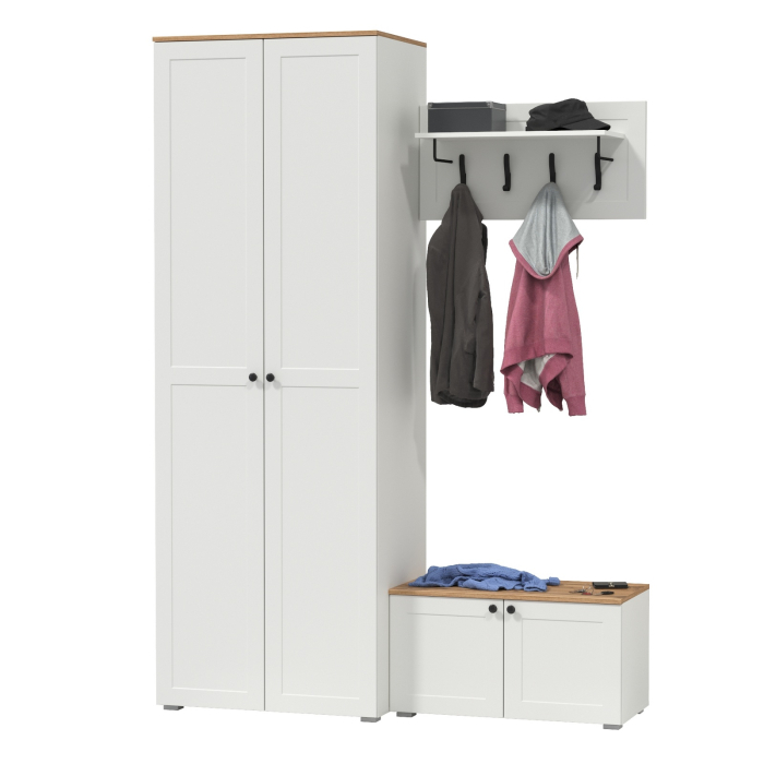 Комплектация состоит из шкафа Остин 13.224, тумбы Остин 13.257 и вешалки Остин 15.12. Шкаф с двумя распашными дверьми предлагает удобное решение для хранения вашей одежды и аксессуаров. В его верхней части устроена антресольная полка. Под ней горизонтальная штанга для одежды на плечиках обеспечивает удобное их размещение. Полка и ниша внизу добавляют дополнительное пространство для аксессуаров или других вещей. Максимальная нагрузка на каждую полку - 5 кг. За распашными дверками тумбы находятся два отделения, в каждом из которых имеются полки, расположенные по центру. В тумбе предусмотрены съемные полки, которые можно использовать специально для высокой обуви, обеспечивая удобное и оптимальное распределение. Навесная вешалка с 4 двухрожковыми крючками и полкой для головных уборов. Полка для головных уборов расположена над крючками и поддерживается двумя металлическими элементами. Максимальная нагрузка на каждый крючек - 1,5 кг, на полку - 5 кг. Скрытые направляющие выдвижных ящиков предназначены для обеспечения мягкого и плавного закрывания. Эти направляющие интегрированы таким образом, что они незаметны с внешней стороны, обеспечивая эстетичный внешний вид и комфортное использование мебели. Двери оснащены 4хшарнирными петлями без доводчиков, что обеспечивает простоту использования. Мебель оснащена регулируемыми опорами, выполненными из серого пластика. Лицевая фурнитура в виде черных аккуратных ручек. Изготовлена мебель из популярного материала - ламинированной ДСП 16 мм, торцы окромлены ПХВ плёнкой. Фасады выполнены из рамочного профиля из МДФ со вставками ДВПО с узором. Поставляется в разобранном виде, с комплектом фурнитуры, упакованная в 4-х слойный гофрокартон.