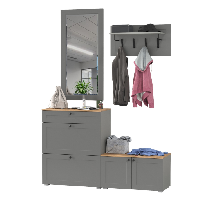 Комплектация состоит из тумбы Остин 13.257, тумбы для обуви Остин 16.121, вешалки Остин 15.12 и зеркала Остин 17.03. За распашными дверками тумбы находятся два отделения, в каждом из которых имеются полки, расположенные по центру. В тумбе предусмотрены съемные полки, которые можно использовать специально для высокой обуви, обеспечивая удобное и оптимальное распределение. Тумба с выдвижным ящиком и 2 откидными дверками с полками для 12 пар обуви снизу. Каждая откидная дверь расчитана для хранения и размещения 6 пар невысокой обуви, что обеспечивает удобство и порядок в Вашей прихожей. Максимальная нагрузка на каждую полку и ящик - 3 кг. Навесная вешалка с 4 двухрожковыми крючками и полкой для головных уборов. Полка для головных уборов расположена над крючками и поддерживается двумя металлическими элементами. Максимальная нагрузка на каждый крючек - 1,5 кг, на полку - 5 кг. Вешалка Остин 15.12 рассчитана для малогаборитных помещений (прихожих, балконов), по приемлемой цене. Классическое прямоугольное навесное зеркало на панели из рамочного профиля МДФ. Зеркальное полотно имеет декоративный скос фаски под углом по всему периметру полотна. Согласно Ваших запросов при установке зеркало возможно повесить как горизонтально, так и вертикально. Скрытые крепежи на задней поверхности и предусматривают выбор расположения зеркала. Скрытые направляющие выдвижных ящиков предназначены для обеспечения мягкого и плавного закрывания. Эти направляющие интегрированы таким образом, что они незаметны с внешней стороны, обеспечивая эстетичный внешний вид и комфортное использование мебели. Двери оснащены 4хшарнирными петлями без доводчиков, что обеспечивает простоту использования. Мебель оснащена регулируемыми опорами, выполненными из серого пластика. Лицевая фурнитура в виде черных аккуратных ручек. Изготовлена мебель из популярного материала - ламинированной ДСП 16 мм, торцы окромлены ПХВ плёнкой. Фасады выполнены из рамочного профиля из МДФ со вставками ДВПО с узором. Поставляется в разобранном виде, с комплектом фурнитуры, упакованная в 4-х слойный гофрокартон.