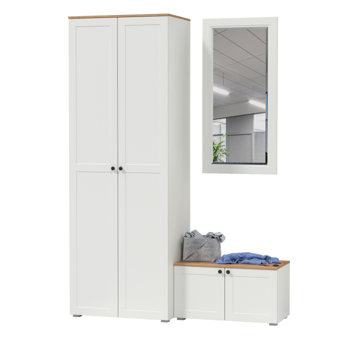 Комплектация состоит из шкафа Остин 13.224, тумбы Остин 13.257, вешалки Остин 15.12 и зеркала Остин 17.03. Шкаф с двумя распашными дверьми предлагает удобное решение для хранения вашей одежды и аксессуаров. В его верхней части устроена антресольная полка. Под ней горизонтальная штанга для одежды на плечиках обеспечивает удобное их размещение. Полка и ниша внизу добавляют дополнительное пространство для аксессуаров или других вещей. Макс. нагрузка на каждую полку - 5 кг. За распашными дверками тумбы находятся два отделения, в каждом из которых имеются полки, расположенные по центру. В тумбе предусмотрены съемные полки, для высокой обуви. Навесная вешалка с 4 двухрожковыми крючками и полкой для головных уборов. Полка для головных уборов расположена над крючками и поддерживается двумя металлическими элементами. Макс. нагрузка на каждый крючек - 1,5 кг, на полку - 5 кг. Навесное зеркало на панели из рамочного профиля МДФ. Зеркальное полотно имеет декоративный скос. Зеркало возможно повесить как горизонтально, так и вертикально. Скрытые крепежи зеркала. Скрытые направляющие выдвижных ящиков. Двери оснащены 4хшарнирными петлями без доводчиков, что обеспечивает простоту использования. Мебель оснащена регулируемыми опорами, выполненными из серого пластика. Лицевая фурнитура в виде черных аккуратных ручек. Изготовлена мебель из популярного материала - ламинированной ДСП 16 мм, торцы окромлены ПХВ плёнкой. Фасады выполнены из рамочного профиля из МДФ со вставками ДВПО с узором. Поставляется в разобранном виде.