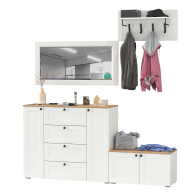 Комплектация состоит из комода Остин 16.221, тумбы Остин 13.257, вешалки Остин 15.12 и зеркала Остин 17.03. Комод имеет три части - центральная - это 4 выдвижных ящика, по бокам расположены закрытые распашными дверками ниши с двумя полками в каждой. В комоде предусмотрены съемные полки. За распашными дверками тумбы находятся два отделения, в каждом из которых имеются полки, расположенные по центру. В тумбе предусмотрены съемные полки, для высокой обуви. Навесная вешалка с 4 двухрожковыми крючками и полкой для головных уборов. Полка для головных уборов расположена над крючками и поддерживается двумя металлическими элементами. Макс. нагрузка на каждый крючек - 1,5 кг, на полку - 5 кг. Навесное зеркало на панели из рамочного профиля МДФ. Зеркальное полотно имеет декоративный скос. Зеркало возможно повесить как горизонтально, так и вертикально. Скрытые крепежи зеркала. Скрытые направляющие выдвижных ящиков. Двери оснащены 4хшарнирными петлями без доводчиков. Мебель оснащена регулируемыми опорами, выполненными из серого пластика. Лицевая фурнитура в виде черных аккуратных ручек. Изготовлена мебель из ЛДСП 16 мм, торцы окромлены ПХВ плёнкой. Фасады из рамочного профиля из МДФ со вставками ДВПО с узором. Поставляется в разобранном виде.